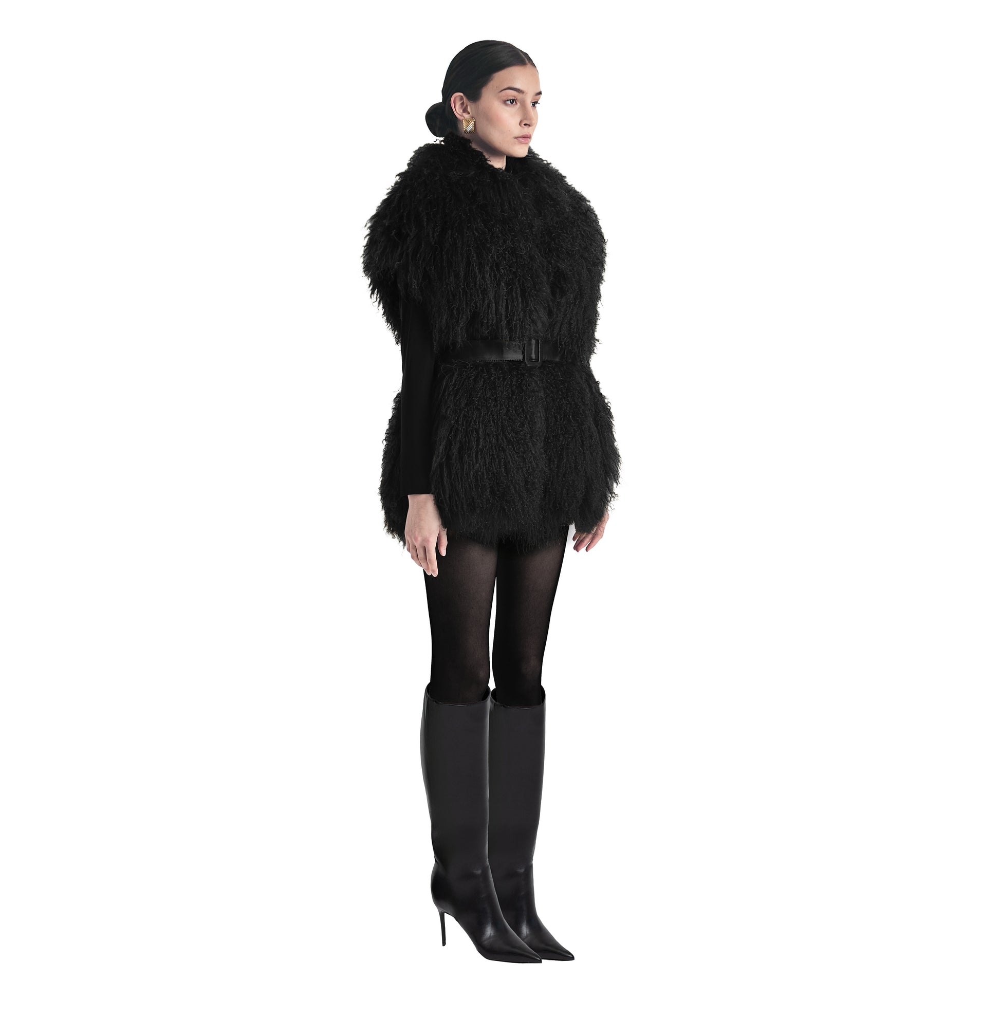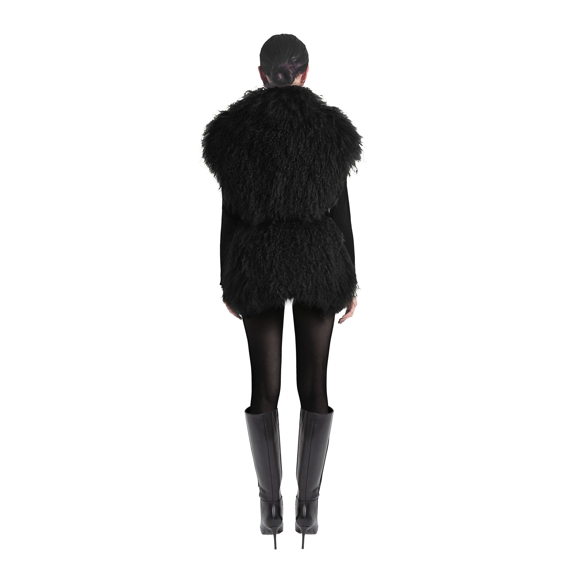 Wrap yourself in glamour this season with the ultimate layering essential. Features luxurious Mongolian shearling. Perfect to pair with a dress or a tee with denim jeans, the options are endless. As each piece is handmade to order, please allow 3-4 weeks for delivery.