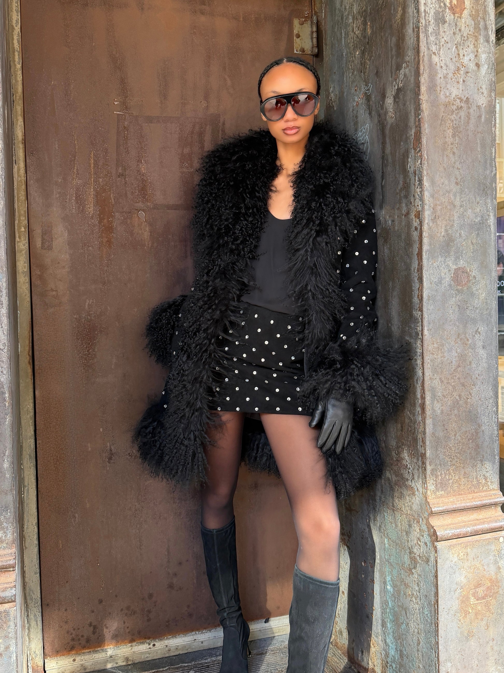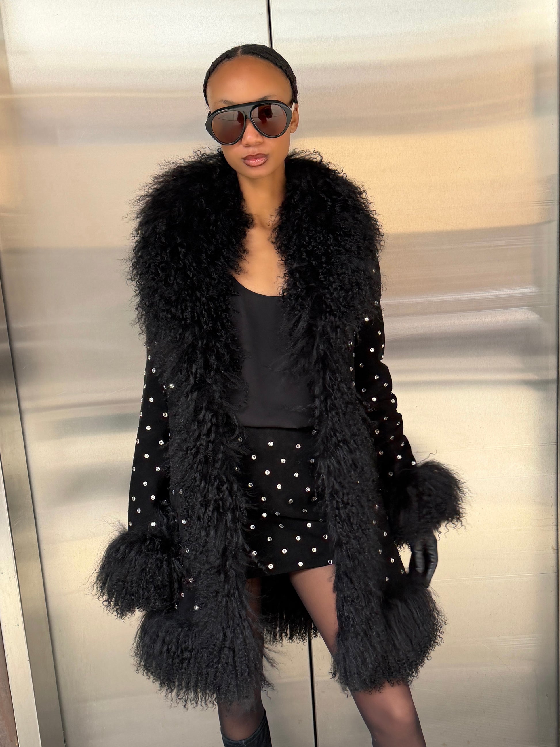 Features the softest suede, crystal-embellishments, and will keep you warm while still looking so chic. Perfect to pair with a dress or a tee with denim jeans. The options are endless with this dreamy Afghan-inspired coat that is truly so sophisticated yet versatile and timeless! As each piece is handmade to order, please allow 2-3 weeks for delivery.