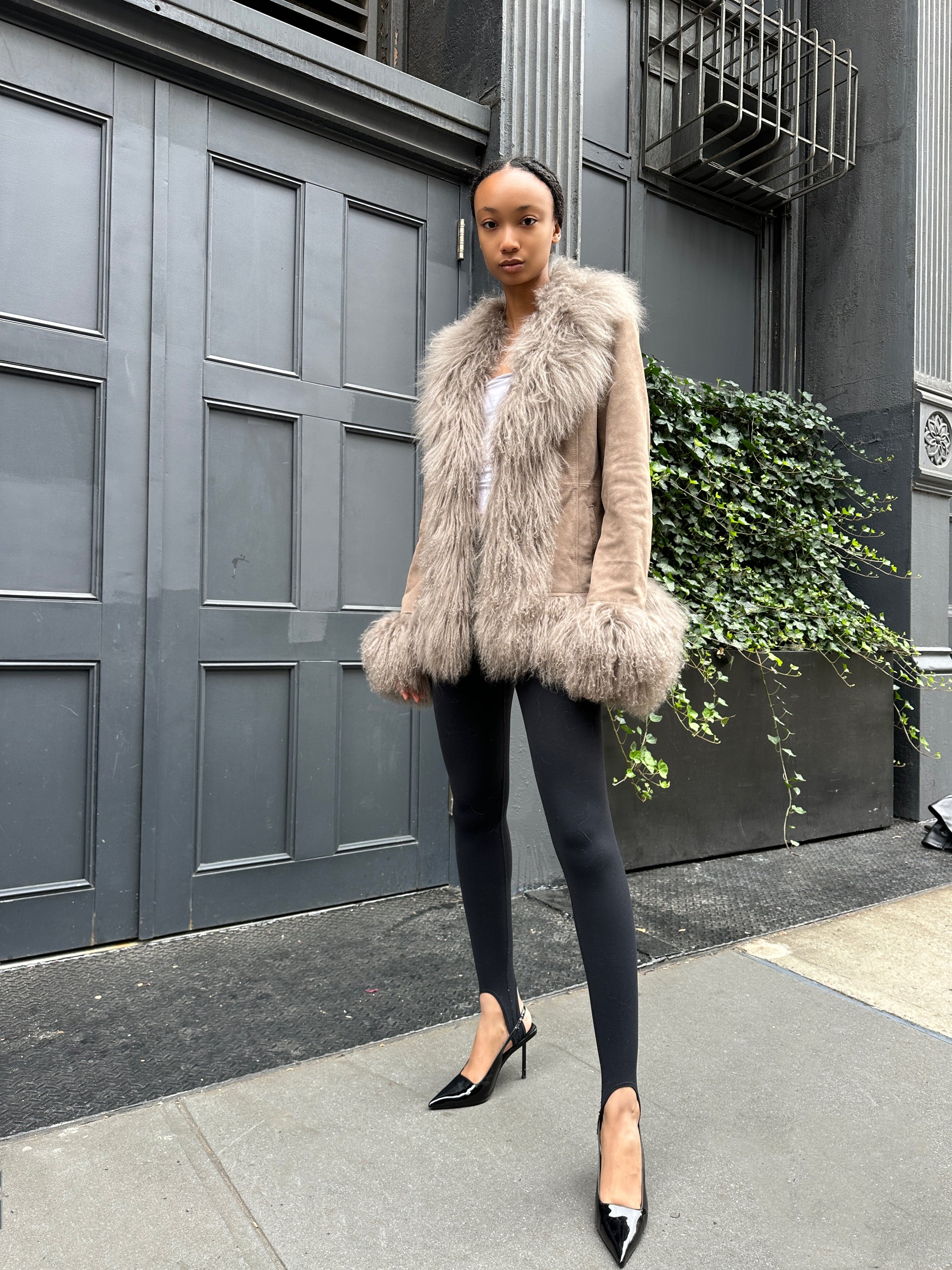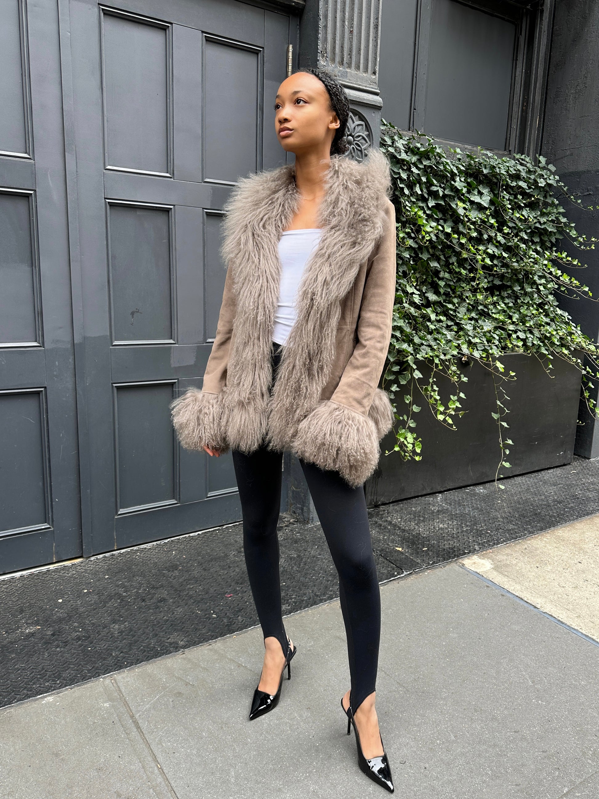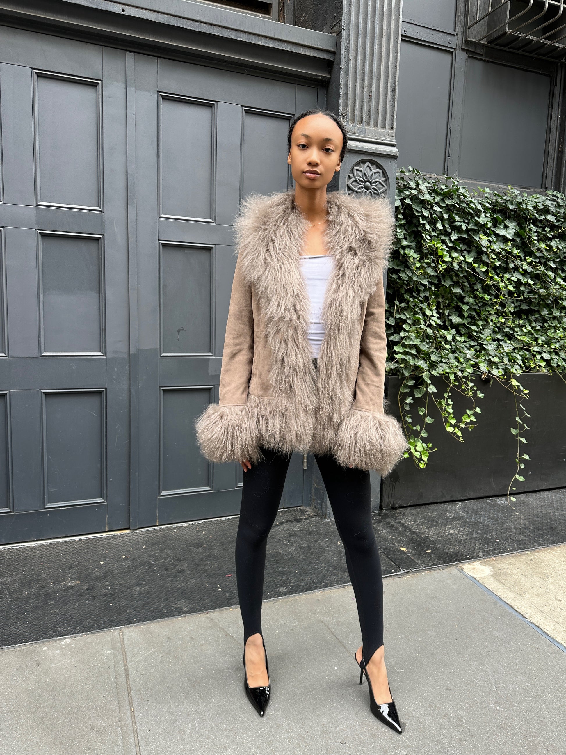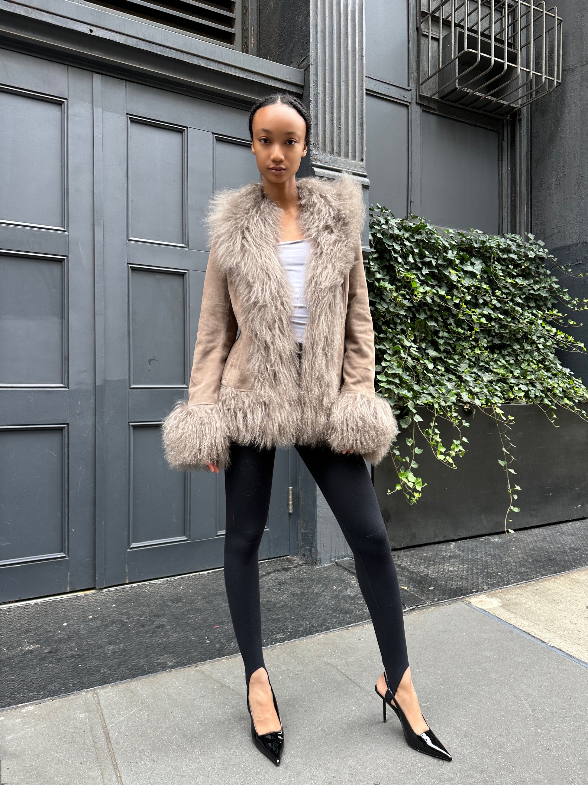 Crafted in premium suede with luxurious Mongolian shearling trim collar. Perfect to pair with a dress or a tee with denim jeans, the options are endless with this dreamy Afghan-inspired coat that is truly so sophisticated yet versatile and timeless! As each piece is handmade to order, please allow 3-4 weeks for delivery.