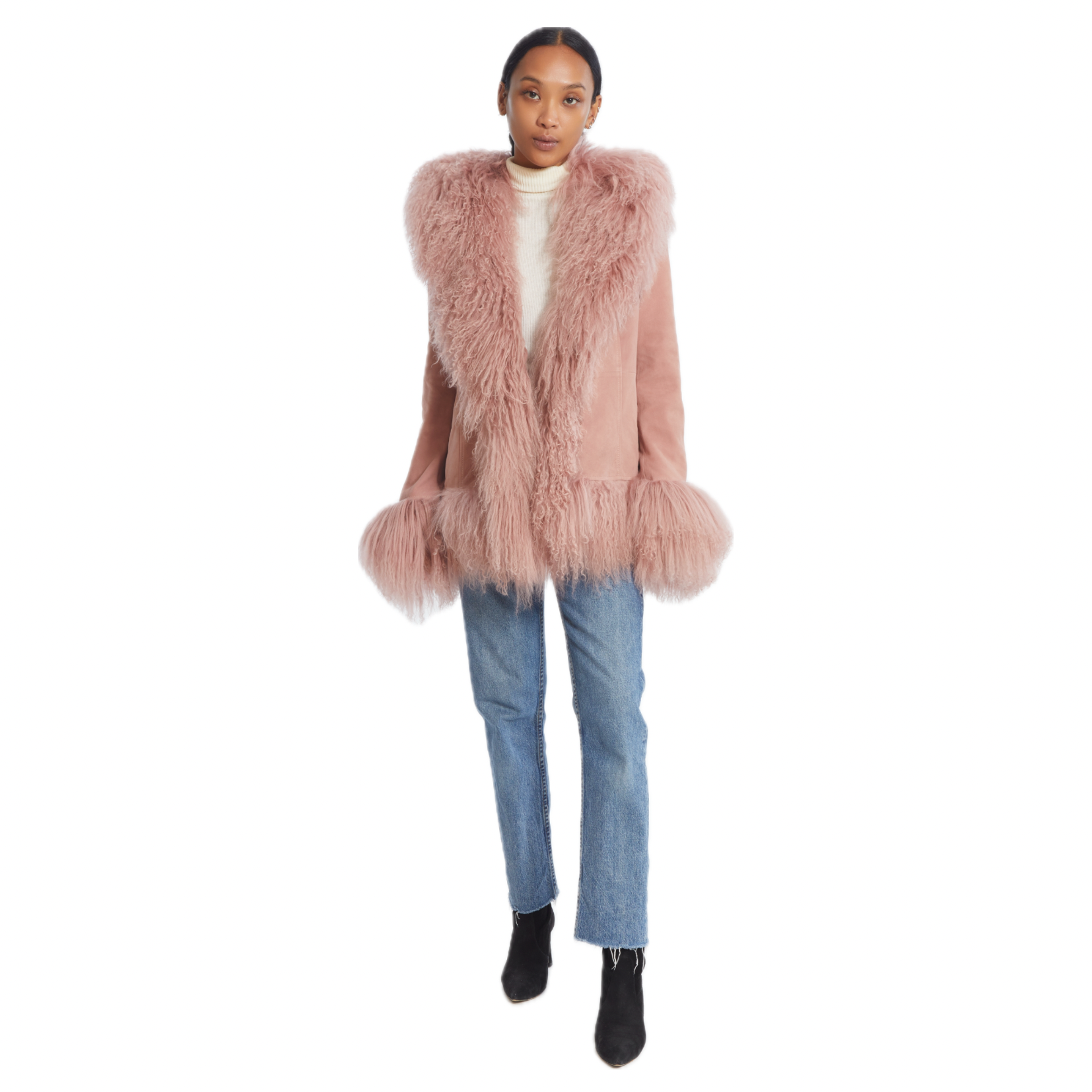 Crafted in premium suede with luxurious Mongolian shearling trim collar. Perfect to pair with a dress or a tee with denim jeans, the options are endless with this dreamy Afghan-inspired coat that is truly so sophisticated yet versatile and timeless! As each piece is handmade to order, please allow 3-4 weeks for delivery.