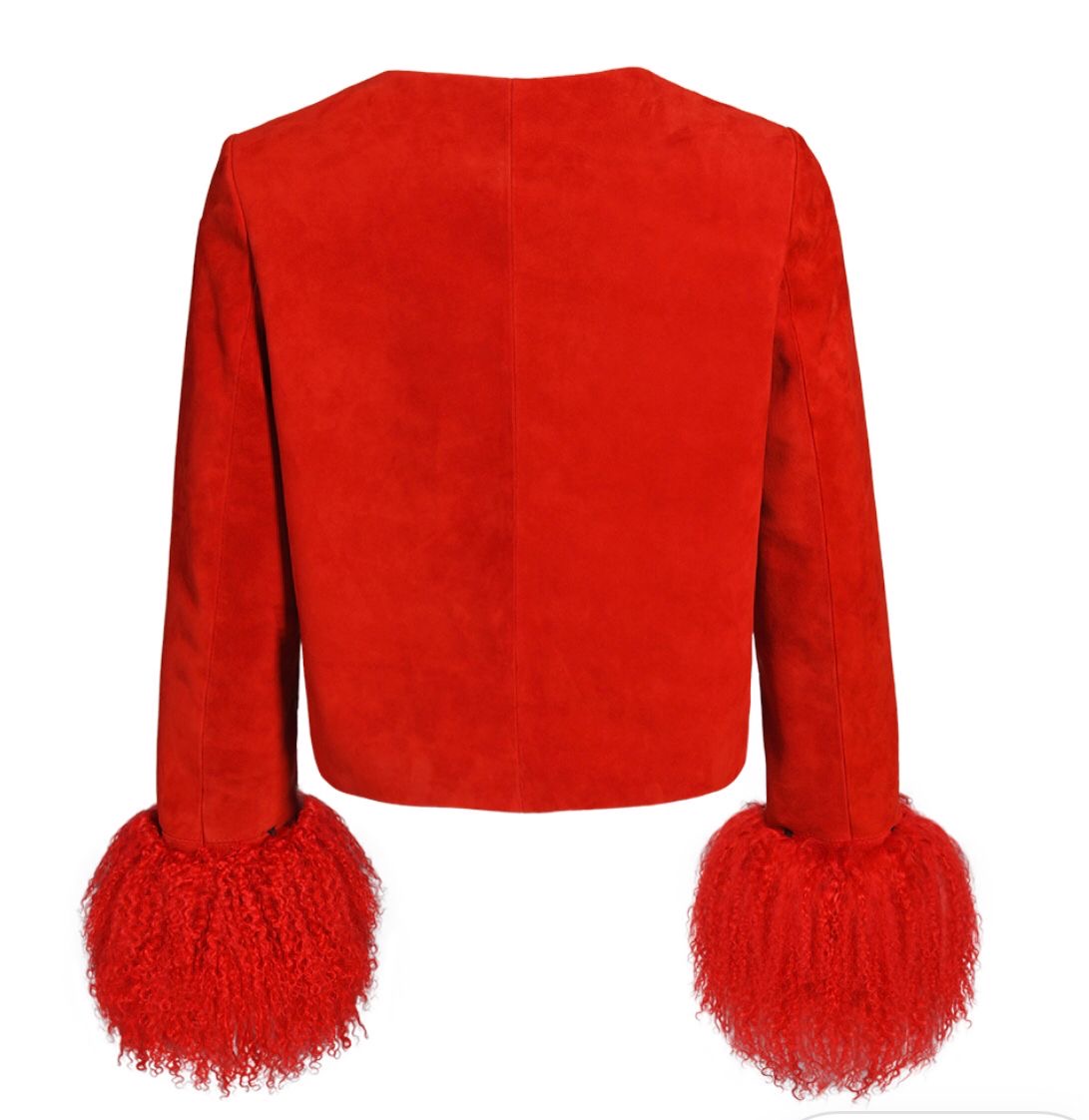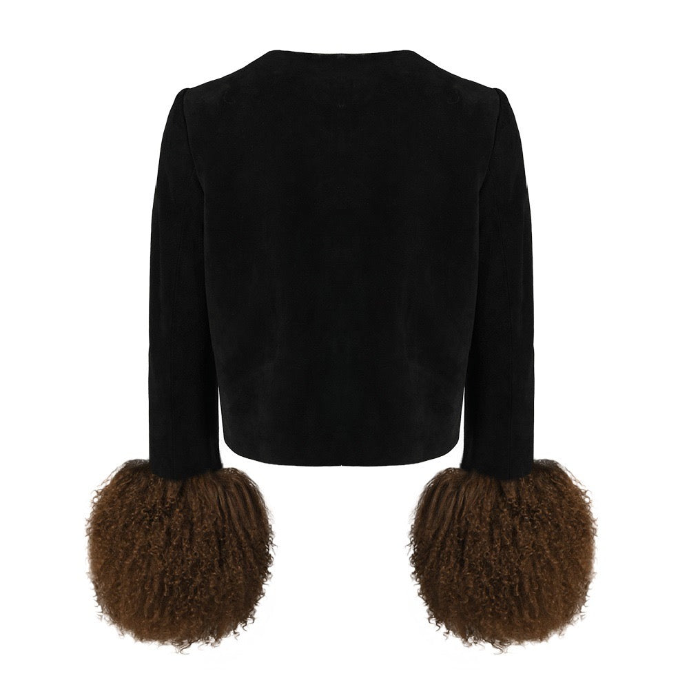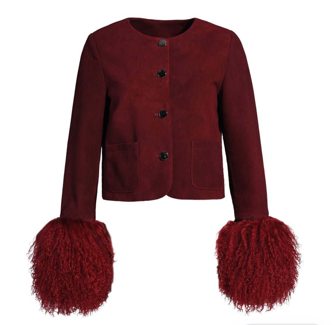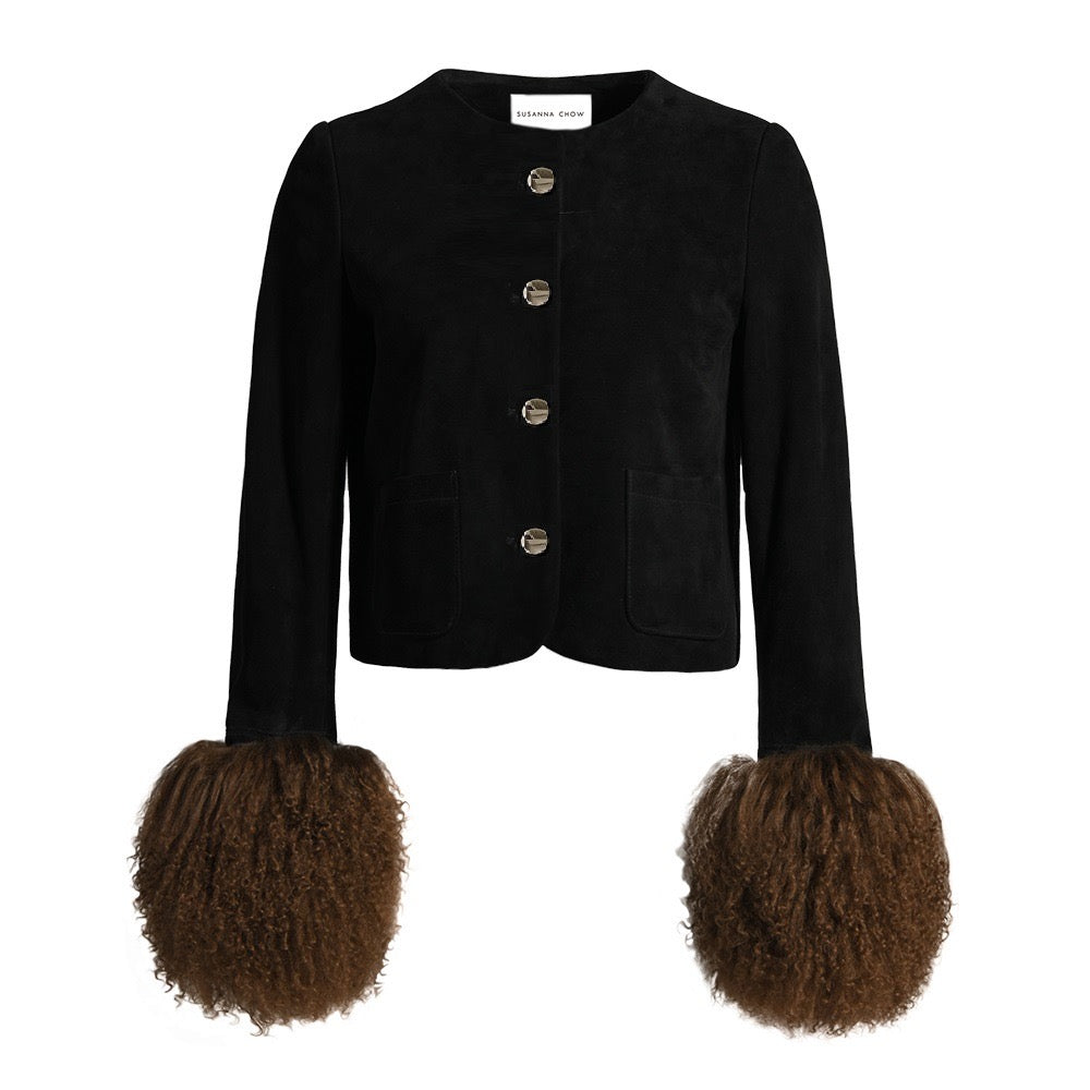 Introducing the Frida jacket that’s effortlessly elegant and guaranteed to keep you looking chic all season long. Perfect to pair over a dress or dress down with jeans. Features removable shearling trim cuffs, exterior pockets. Runs true to size. As each piece is handmade to order, please allow 2-3 weeks for delivery.
