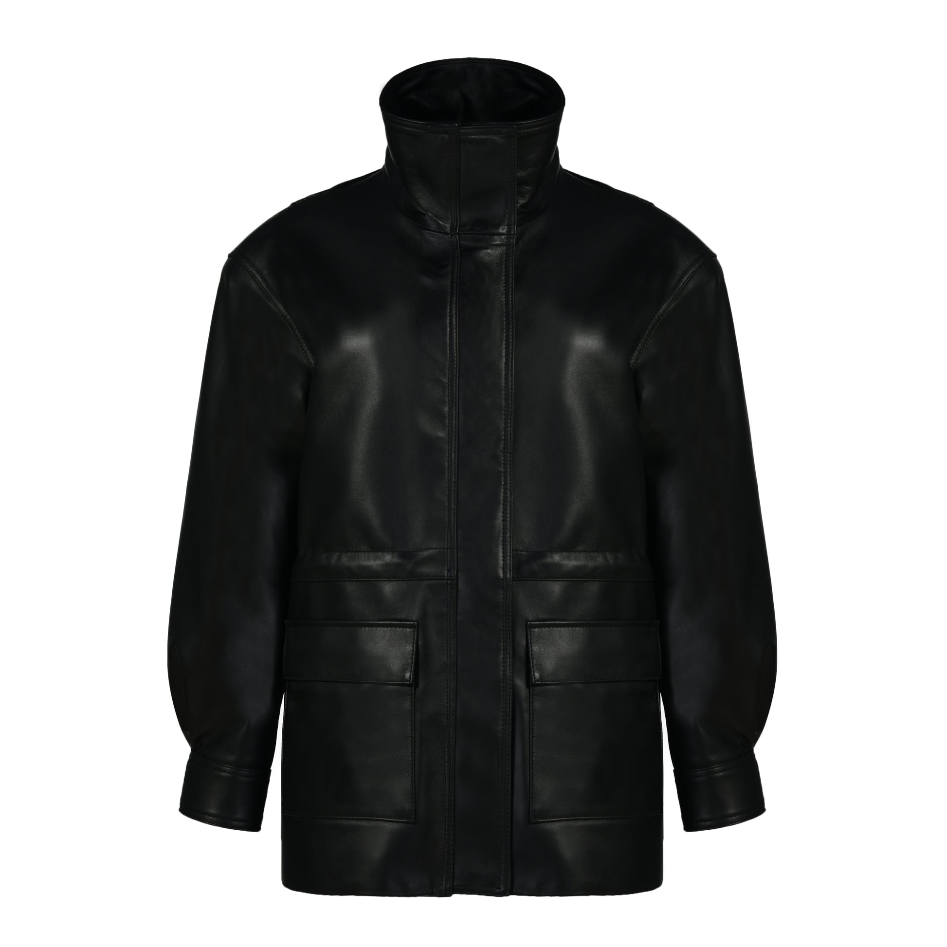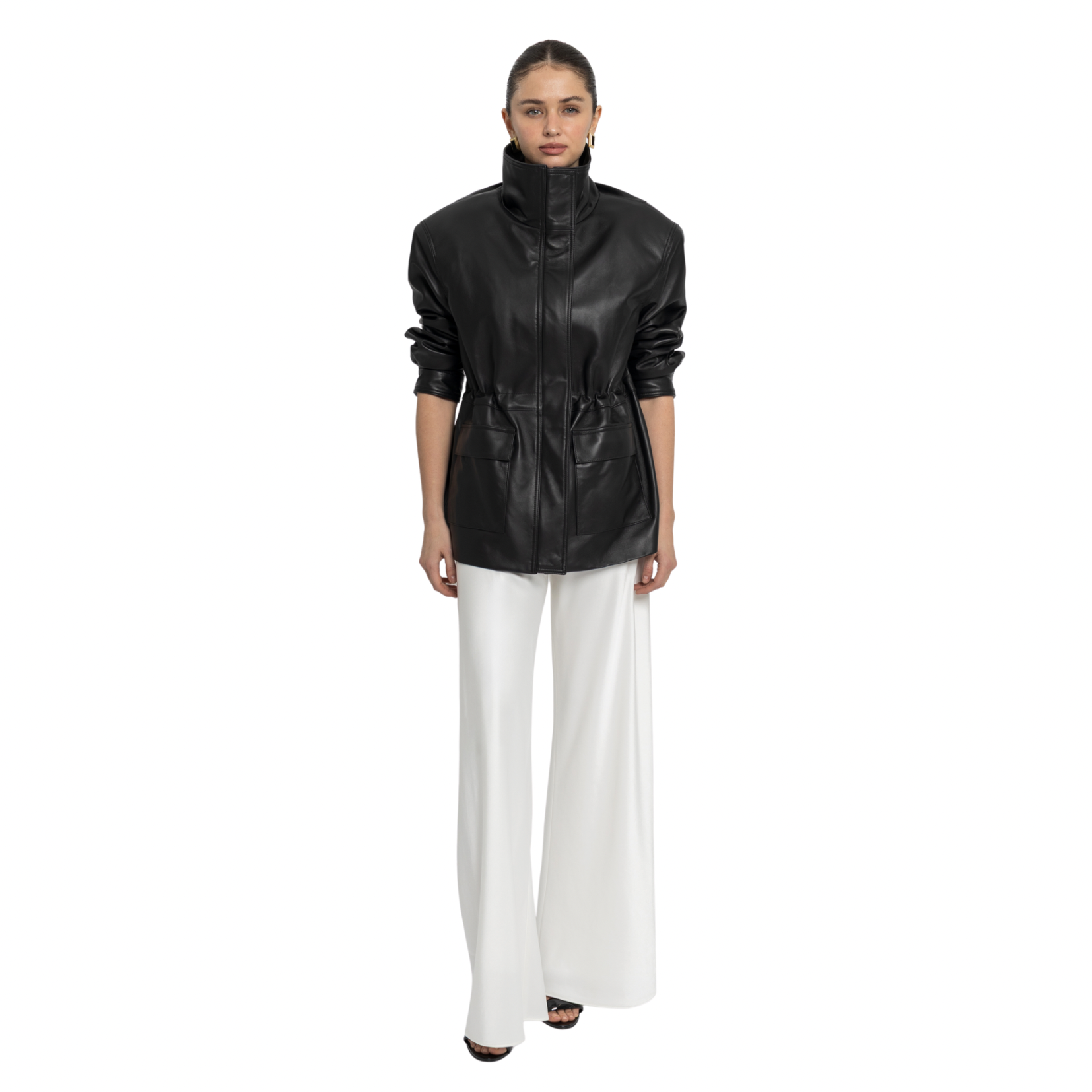 Wrap yourself in glamour this season with this luxuriously sleek and sophisticated leather jacket. Features exterior pockets, interior waist drawstring detail and should pad details. As each piece is handmade to order, please allow 2-3 weeks for delivery.