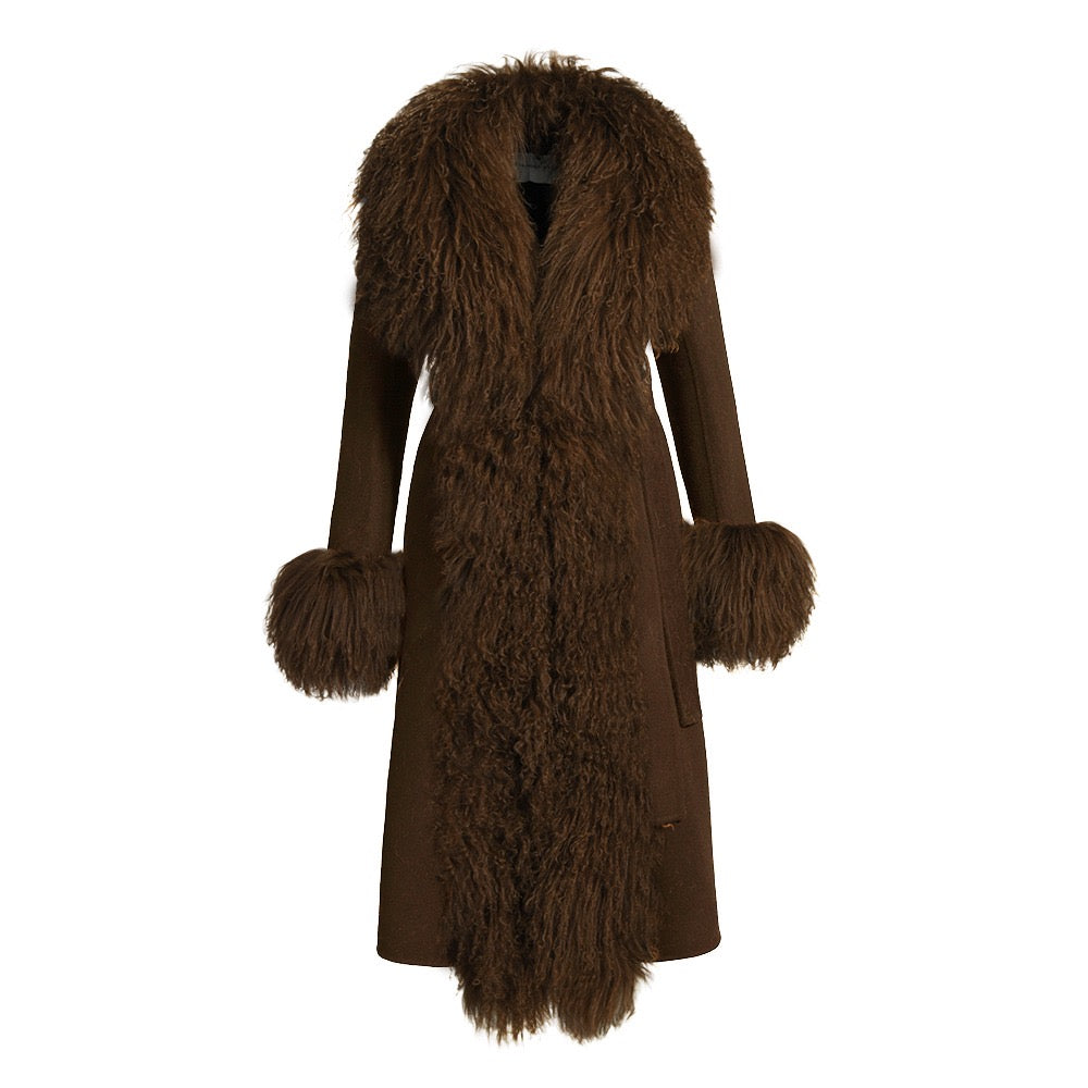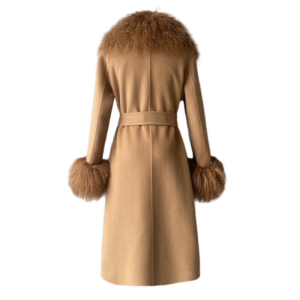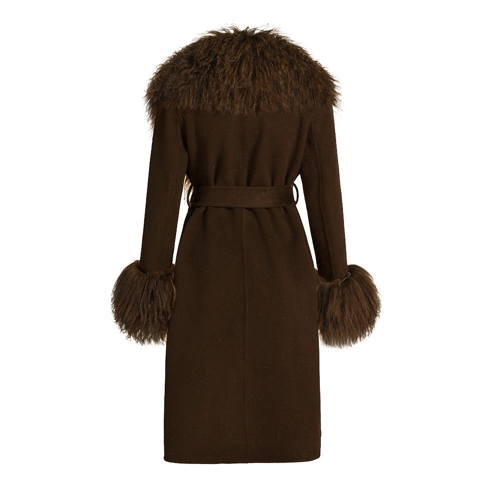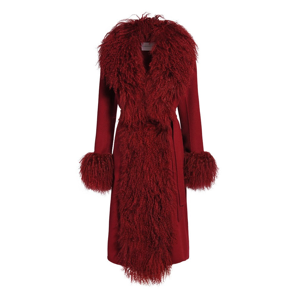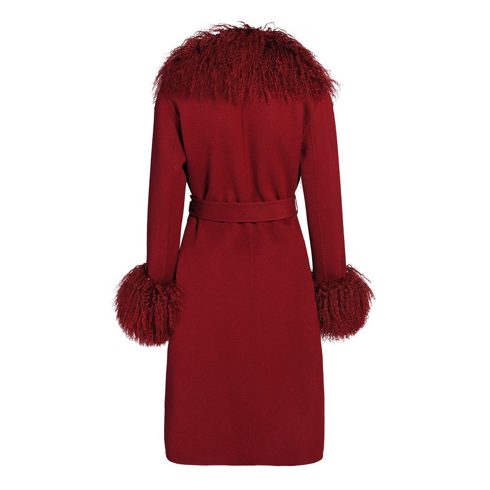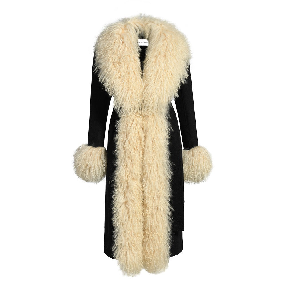 Wrap yourself in timeless sophistication this season with the ultimate statement coat. Features luxurious cashmere with Mongolian shearling trim. Perfect to pair with a dress or a tee with denim jeans, the options are endless. As each piece is handmade to order, please allow 2-3 weeks for delivery.