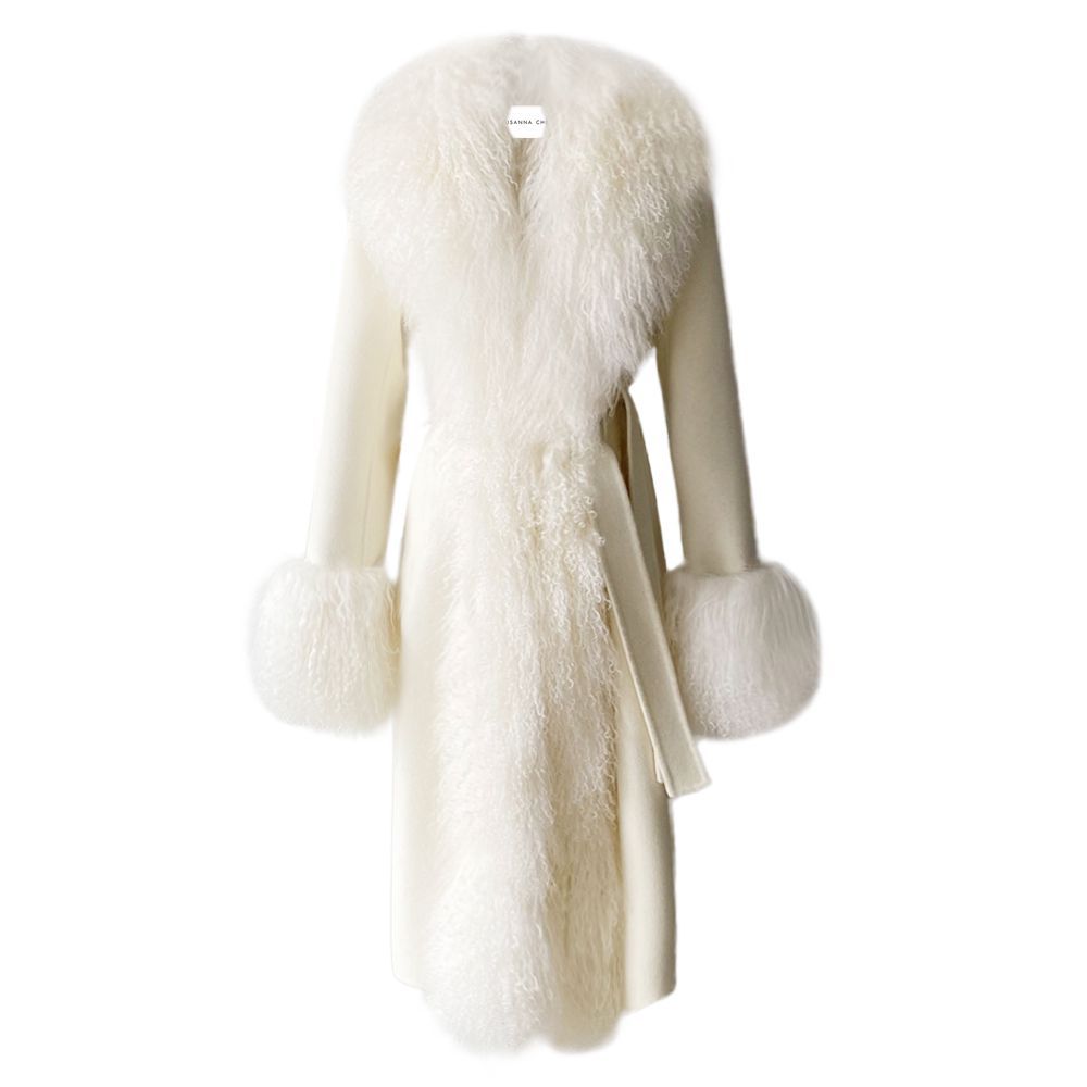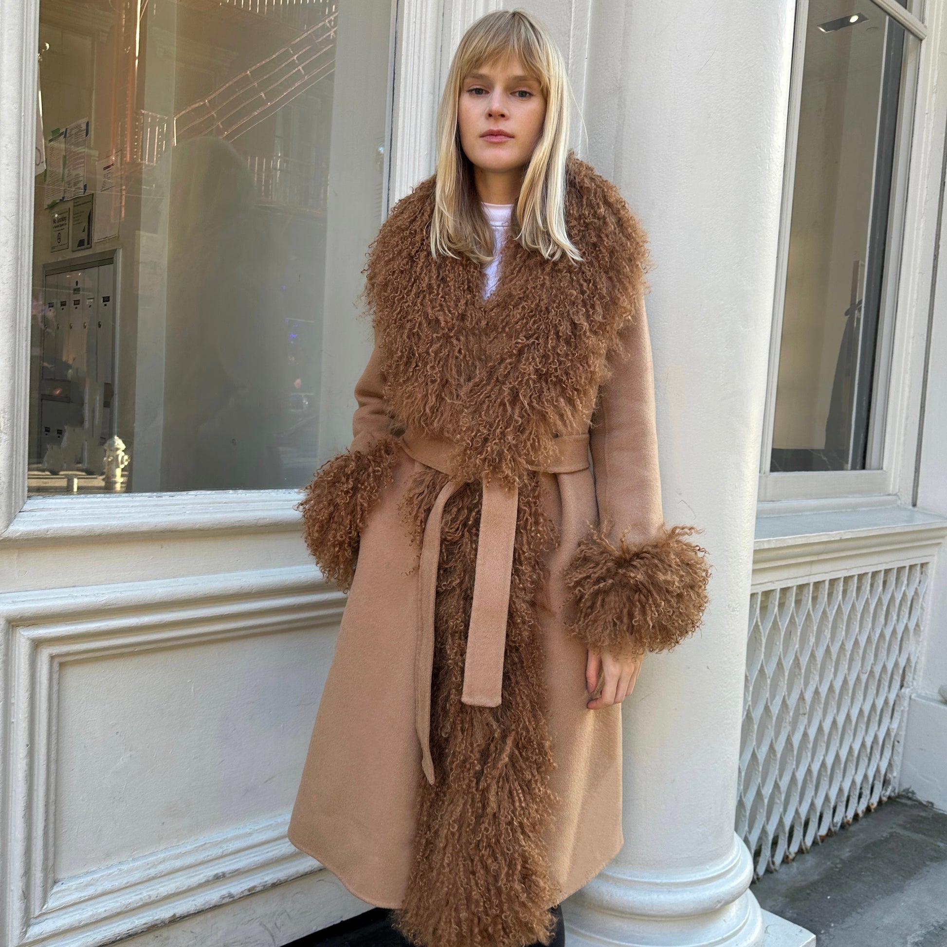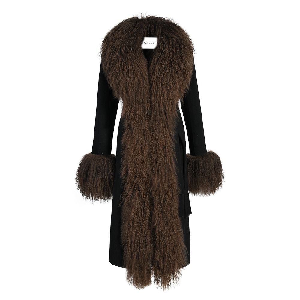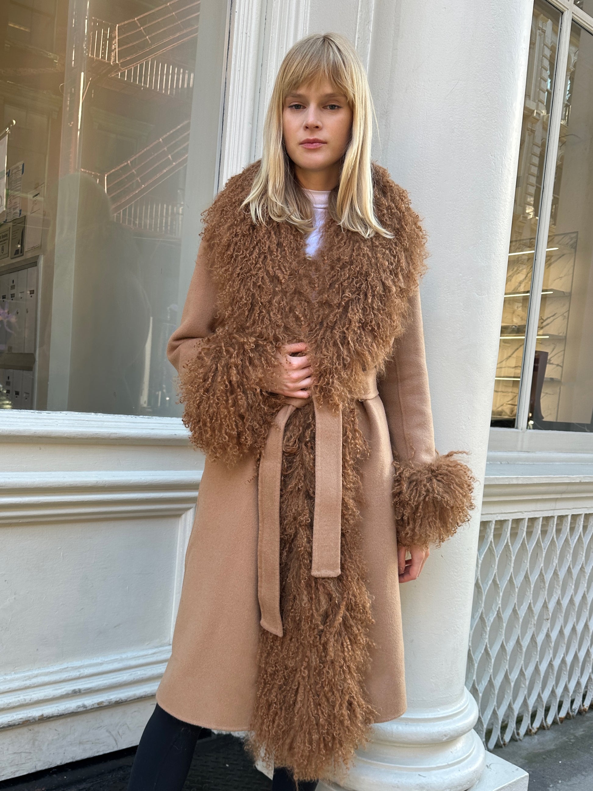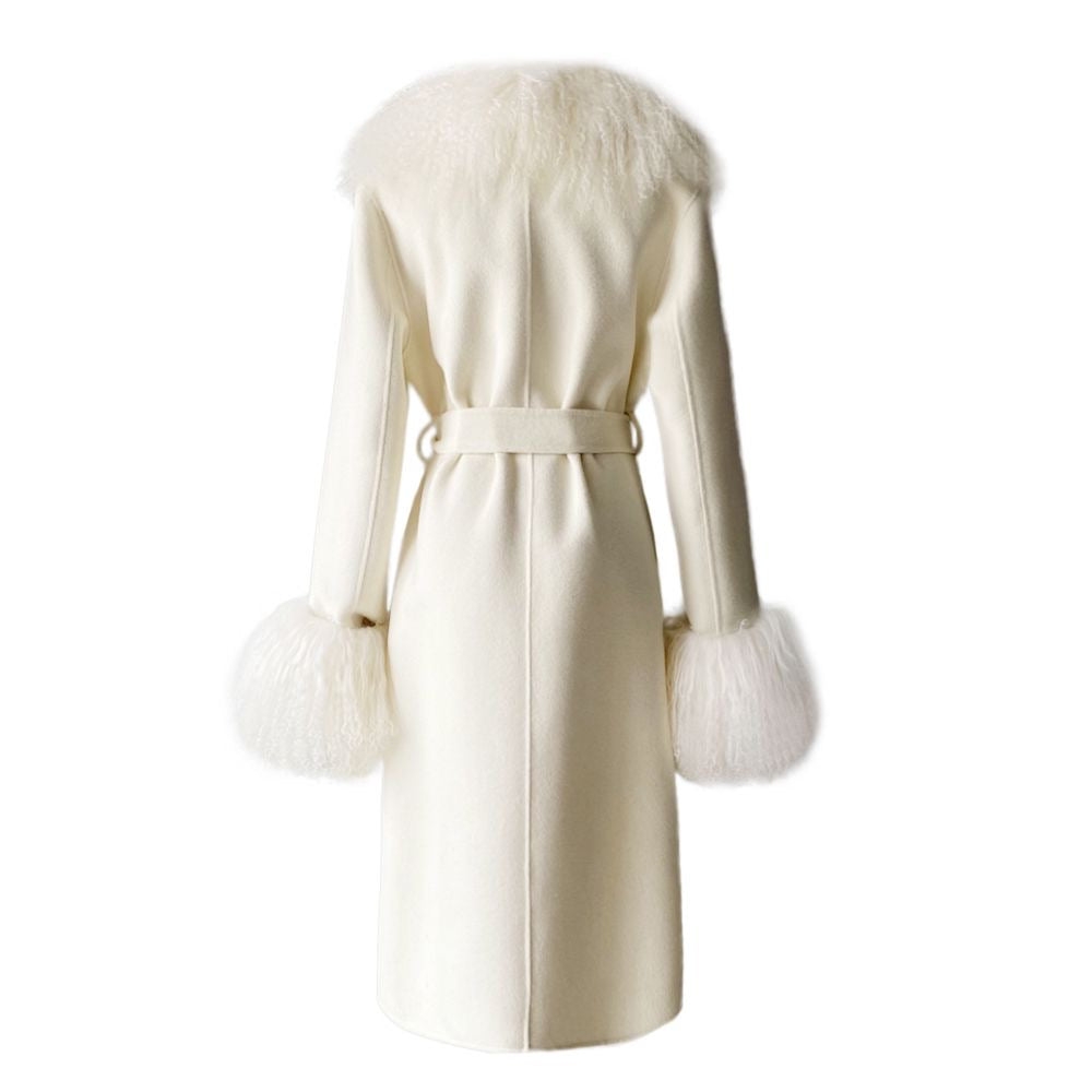 Wrap yourself in timeless sophistication this season with the ultimate statement coat. Features luxurious cashmere with Mongolian shearling trim. Perfect to pair with a dress or a tee with denim jeans, the options are endless. As each piece is handmade to order, please allow 2-3 weeks for delivery.