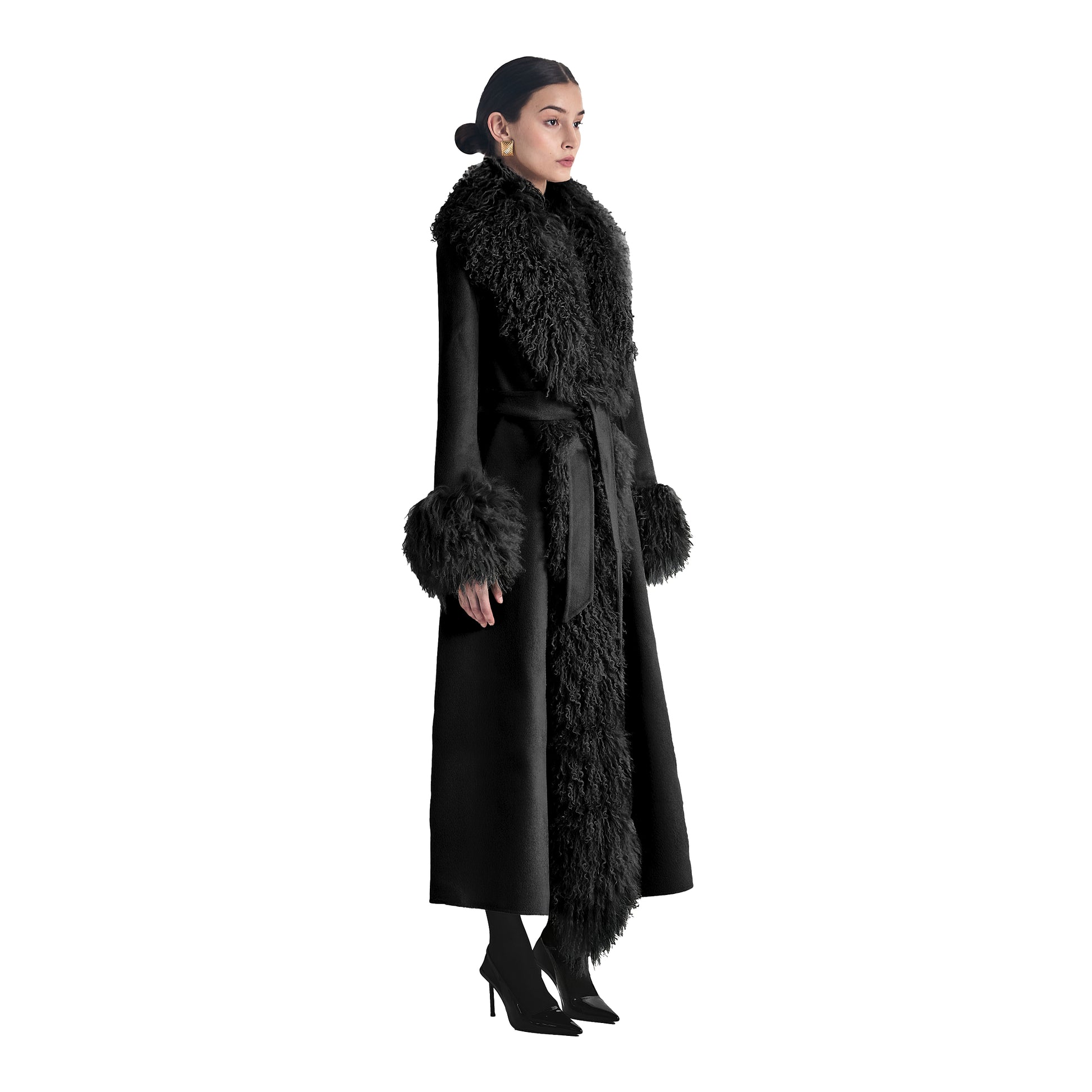 Wrap yourself in timeless sophistication this season with the ultimate statement coat. Features luxurious suede with Mongolian shearling trim. Perfect to pair with a dress or a tee with denim jeans, the options are endless. As each piece is handmade to order, please allow 3-4 weeks for delivery.