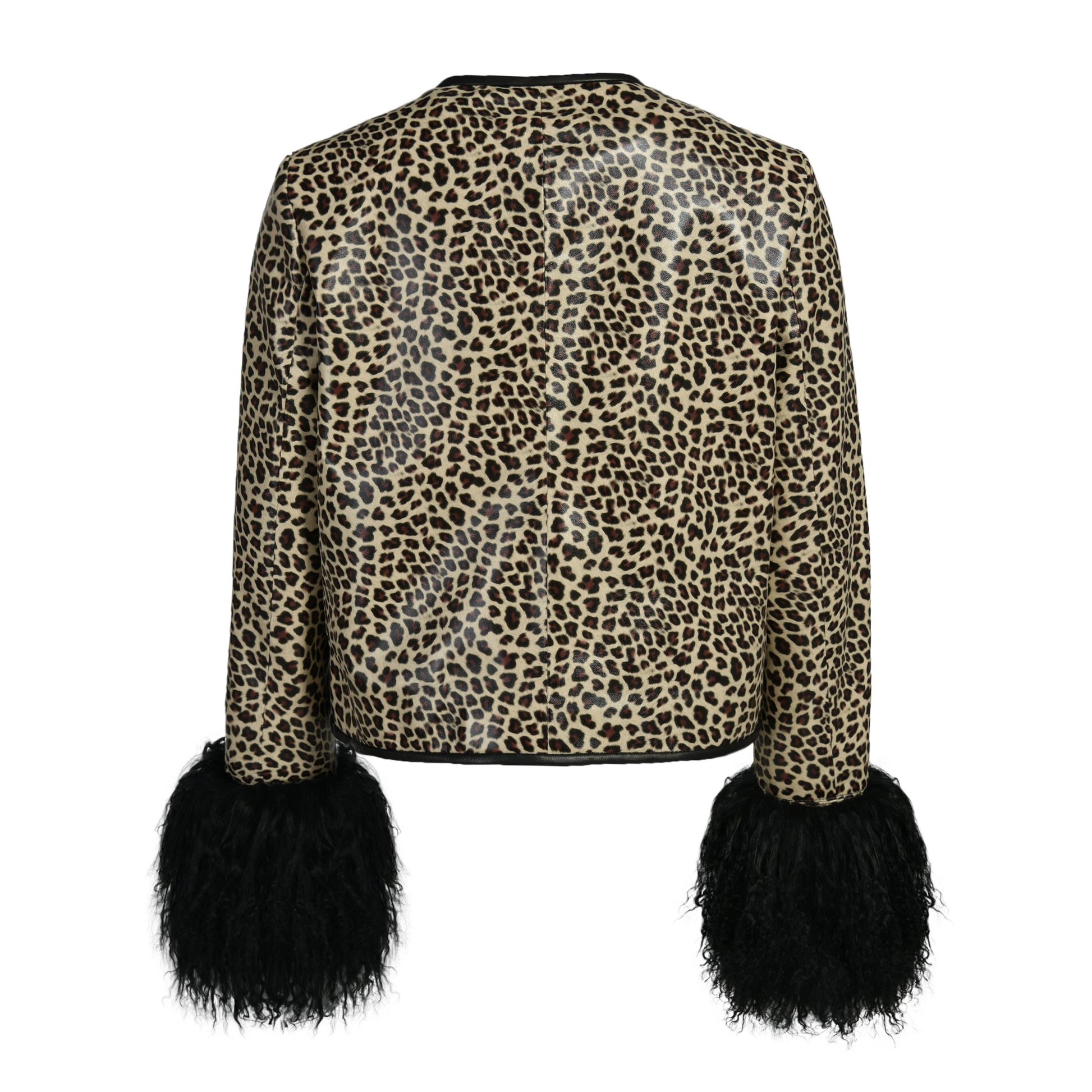 Introducing our newest Leandra leopard-printed leather jacket that’s effortlessly elegant and guaranteed to keep you looking chic all season long. Perfect to pair over a dress or dress down with jeans. Features removable shearling trim cuffs, snap button closures, and exterior pockets. As each piece is handmade to order, please allow 3-4 weeks for delivery.