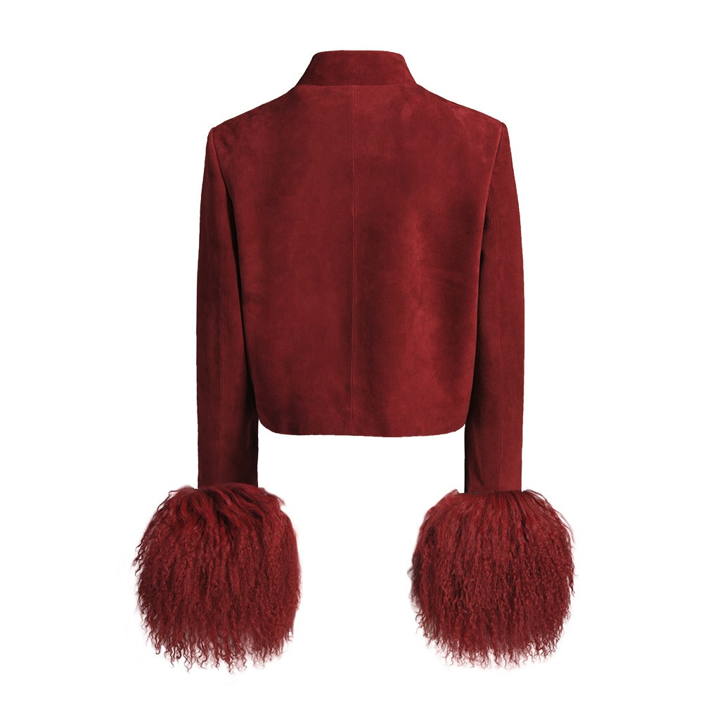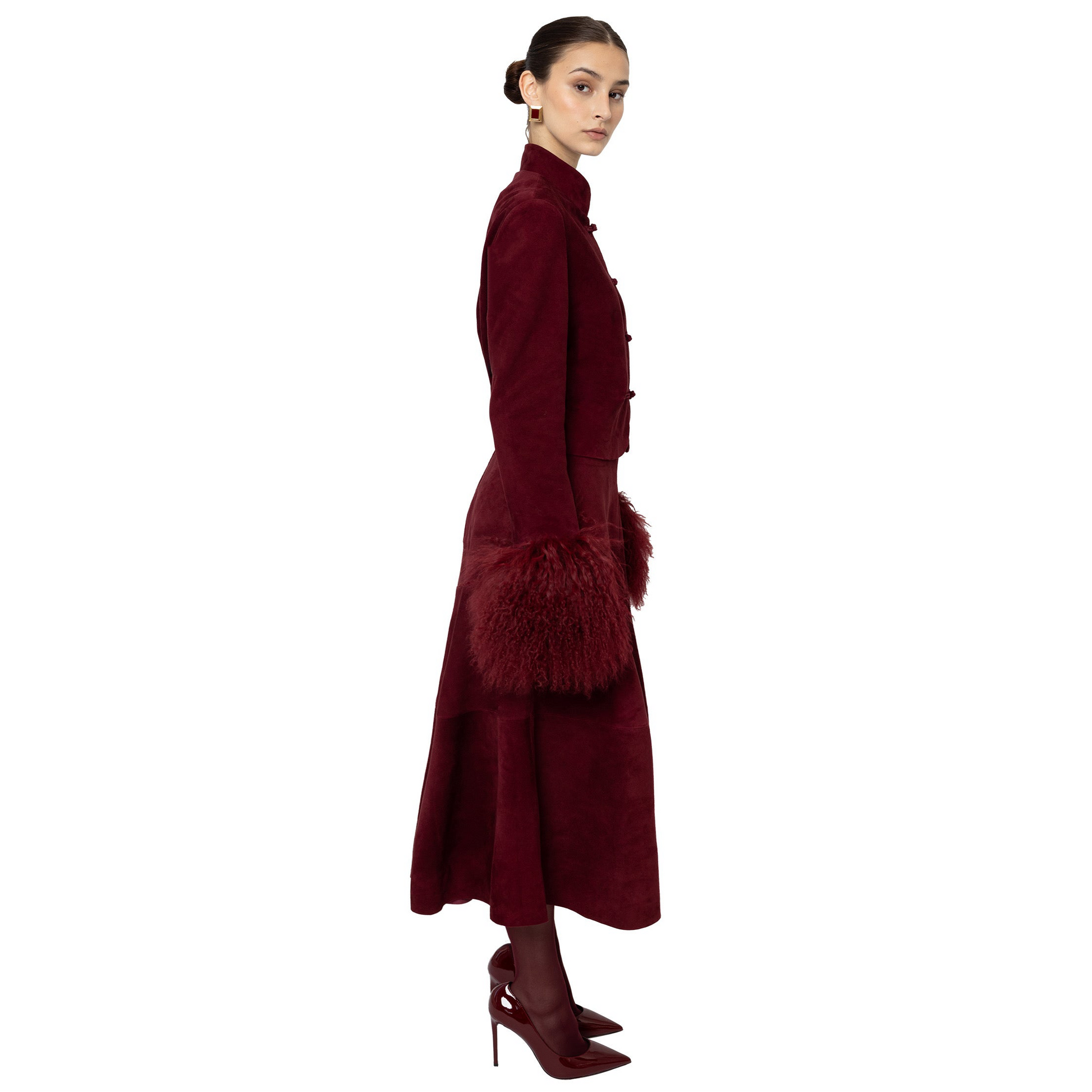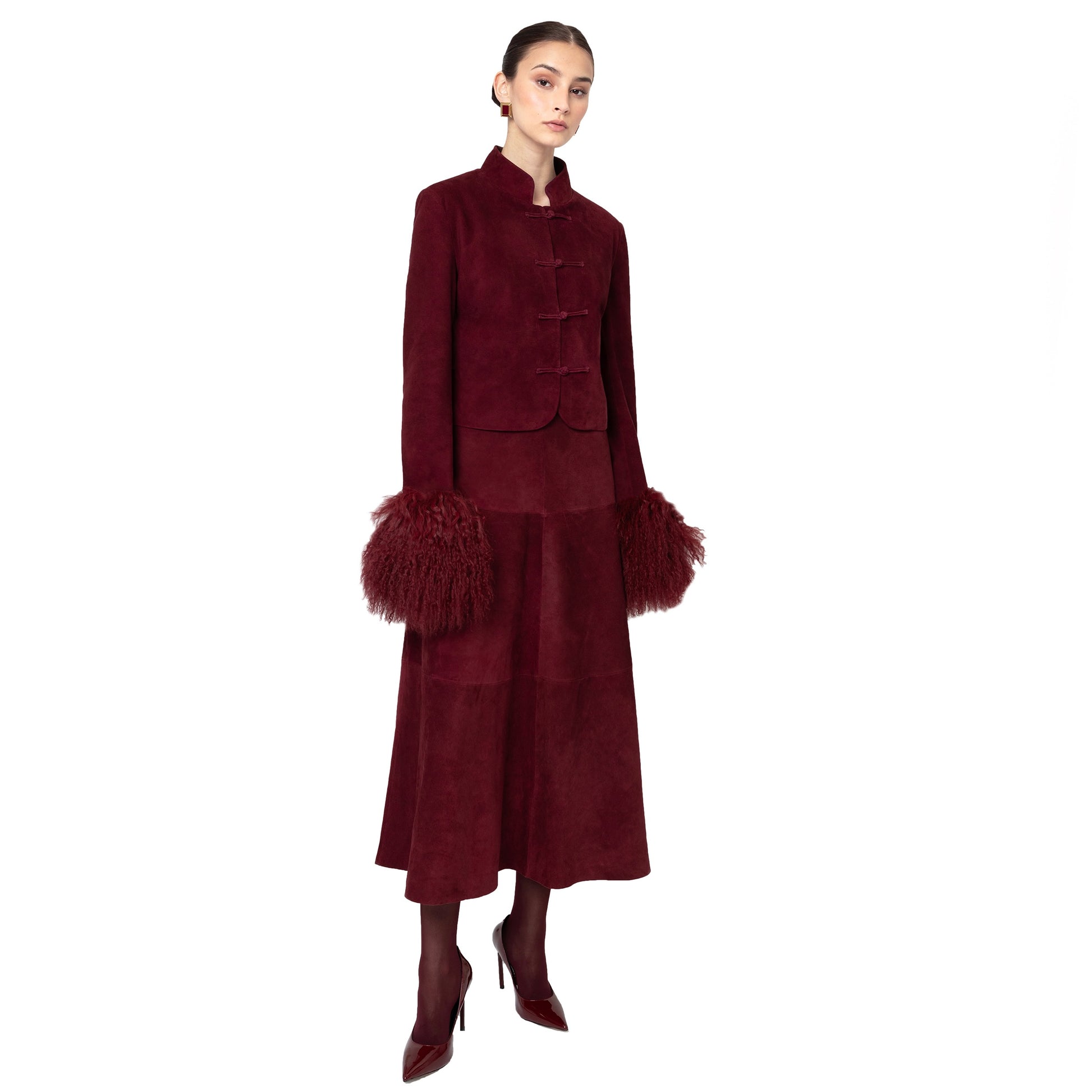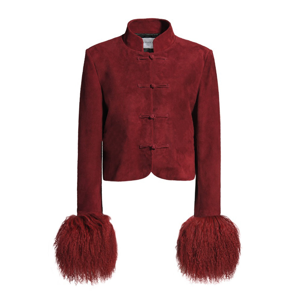 Introducing our newest Leighton jacket, a modern homage to heritage where effortless sophistication meets timeless glamour. Crafted from rich burgundy suede and features a sculpted silhouette with subtle shoulder pads, voluminous shearling cuffs, mandarin collar, and handmade Chinese knot closures in suede. Wear it as a set or let it stand alone - either way, prepare to command attention wherever you go. Runs true to size. Model is 5’9 and wearing size small. As each piece is handmade to order, please allow 2-3 weeks for delivery.