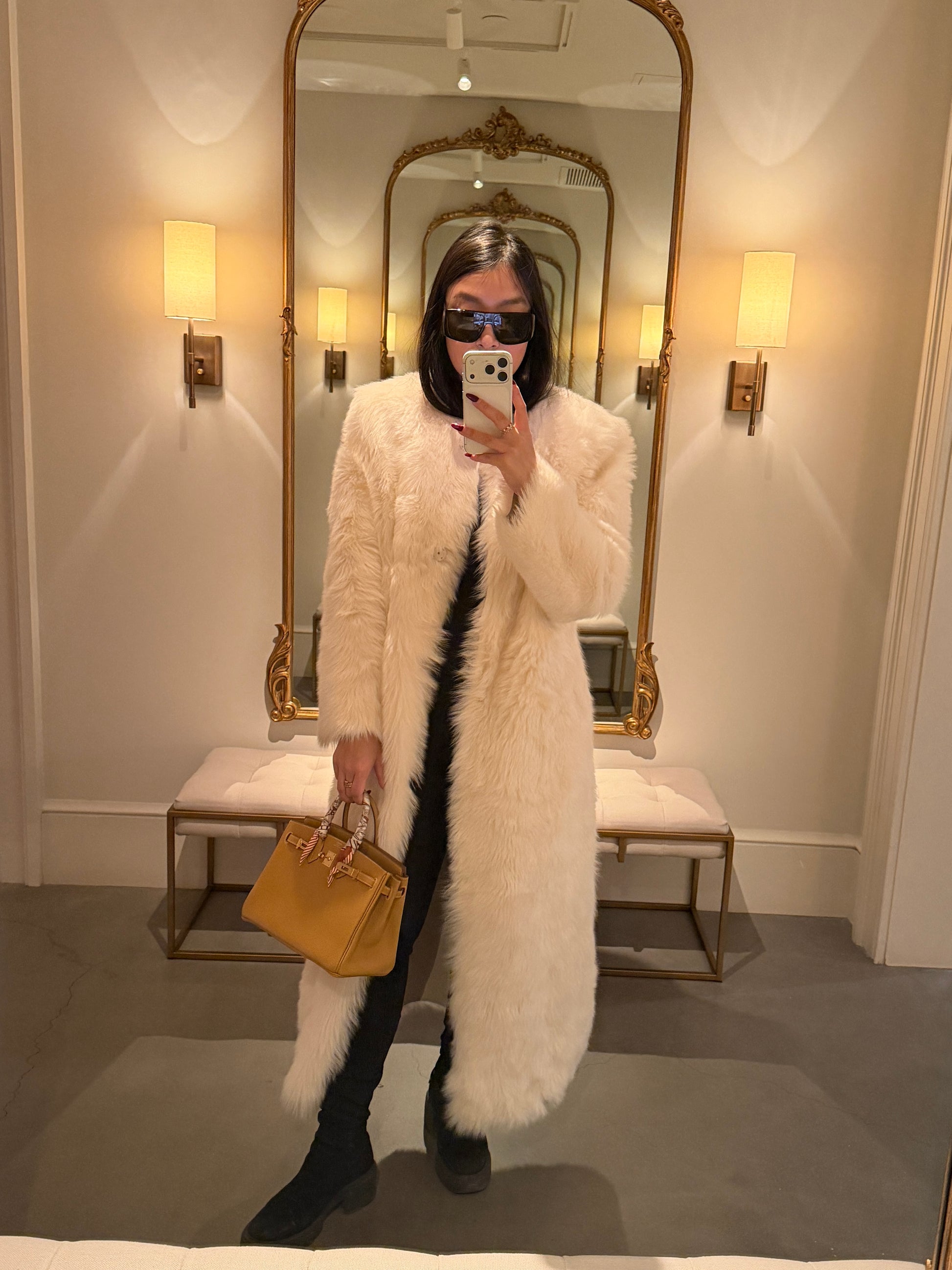 Introducing the Mia shearling coat. Features soft shearling keep you warm while looking so chic. Perfect to pair with a dress or a tee with denim jeans. The options are endless with this dreamy coat that is truly so sophisticated yet versatile and timeless! As each piece is handmade to order, please allow 2 weeks for delivery.