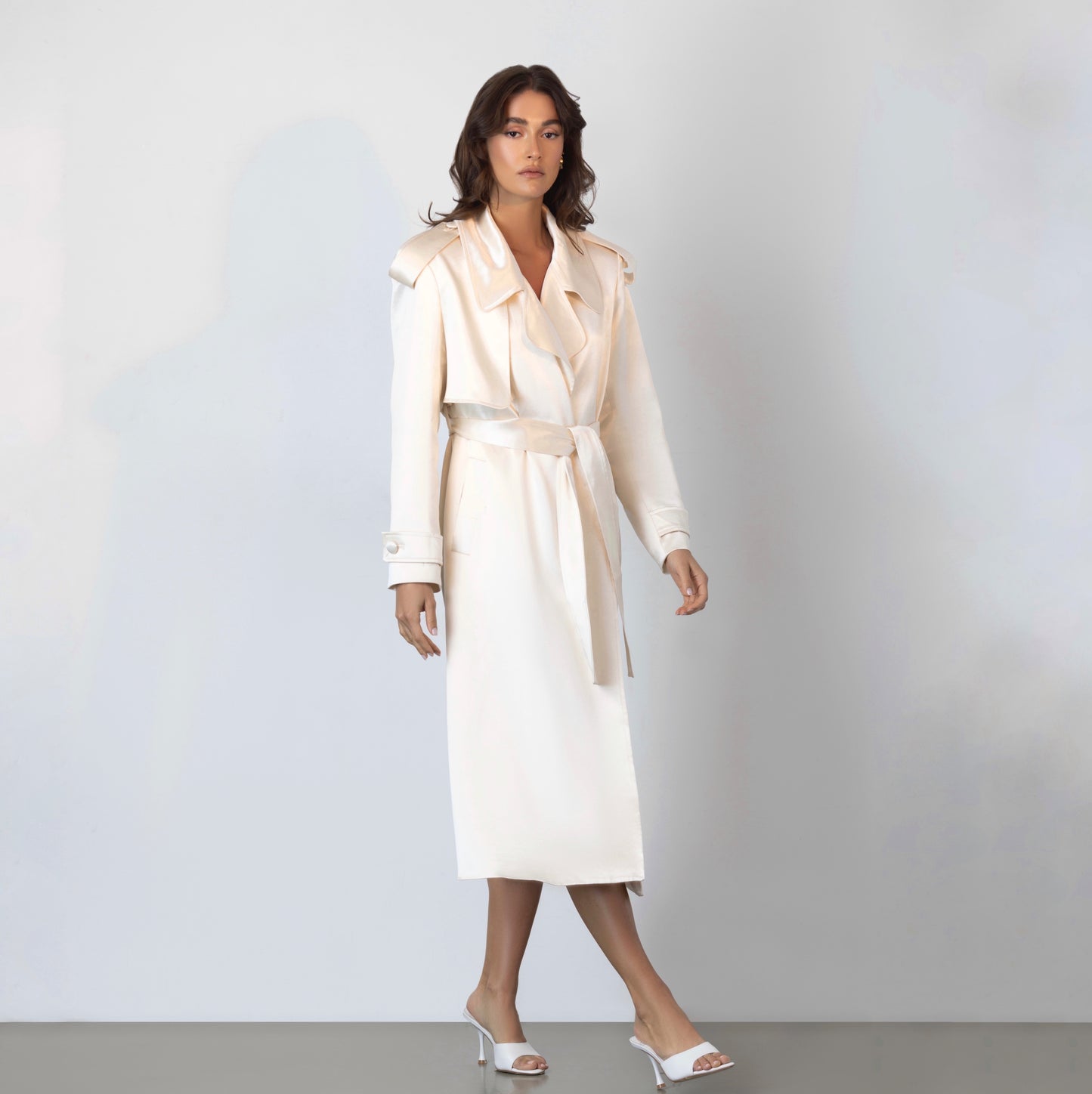 A timeless silhouette reimagined in fluid, lustrous satin. The Olivia satin trench is designed to bring quiet sophistication to every moment — from effortless daytime polish to after-dark elegance. Lightweight yet impactful, it features a softly tailored drape and a detachable tie belt to cinch the waist with subtle definition. A modern wardrobe essential, refined.