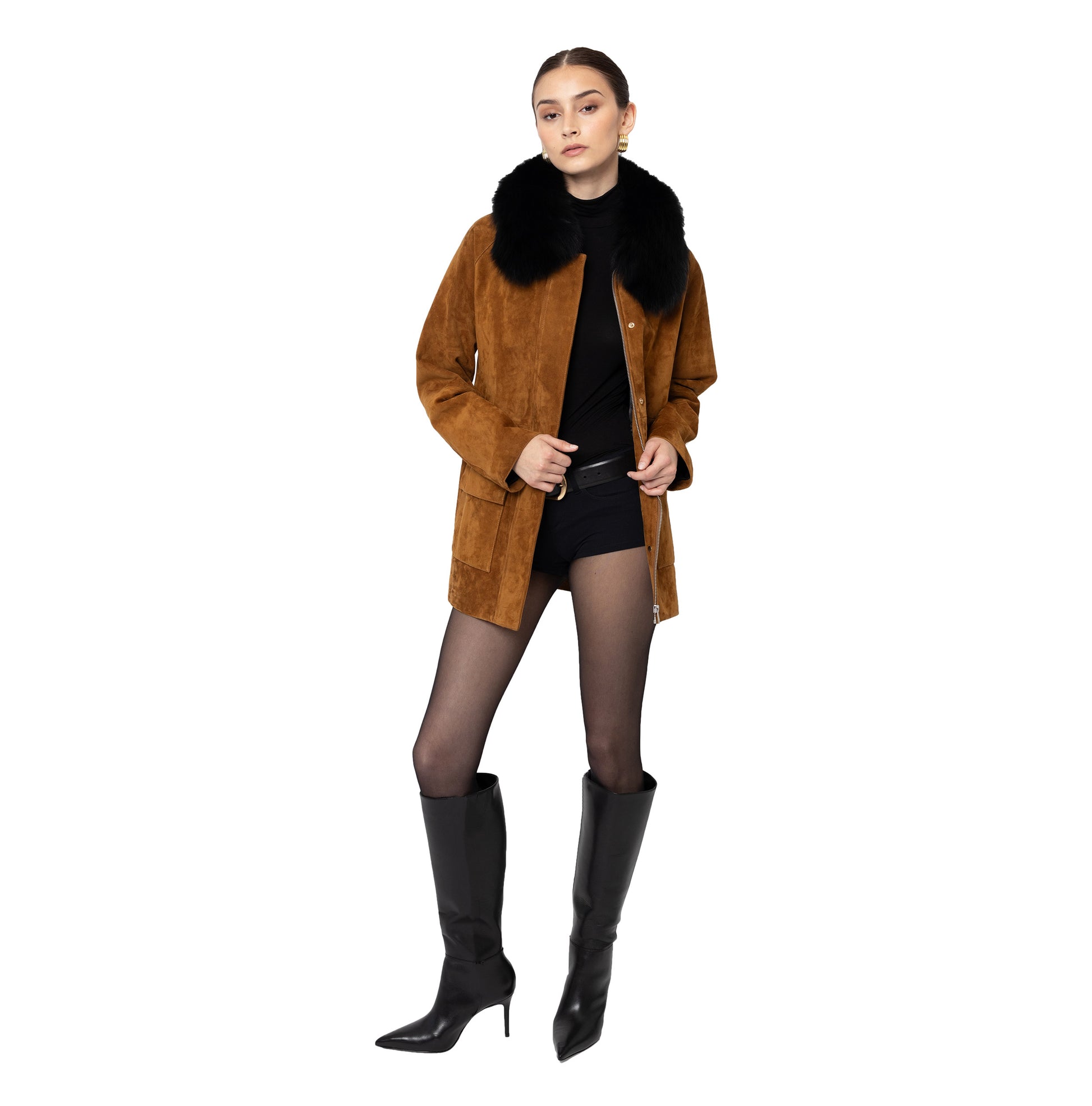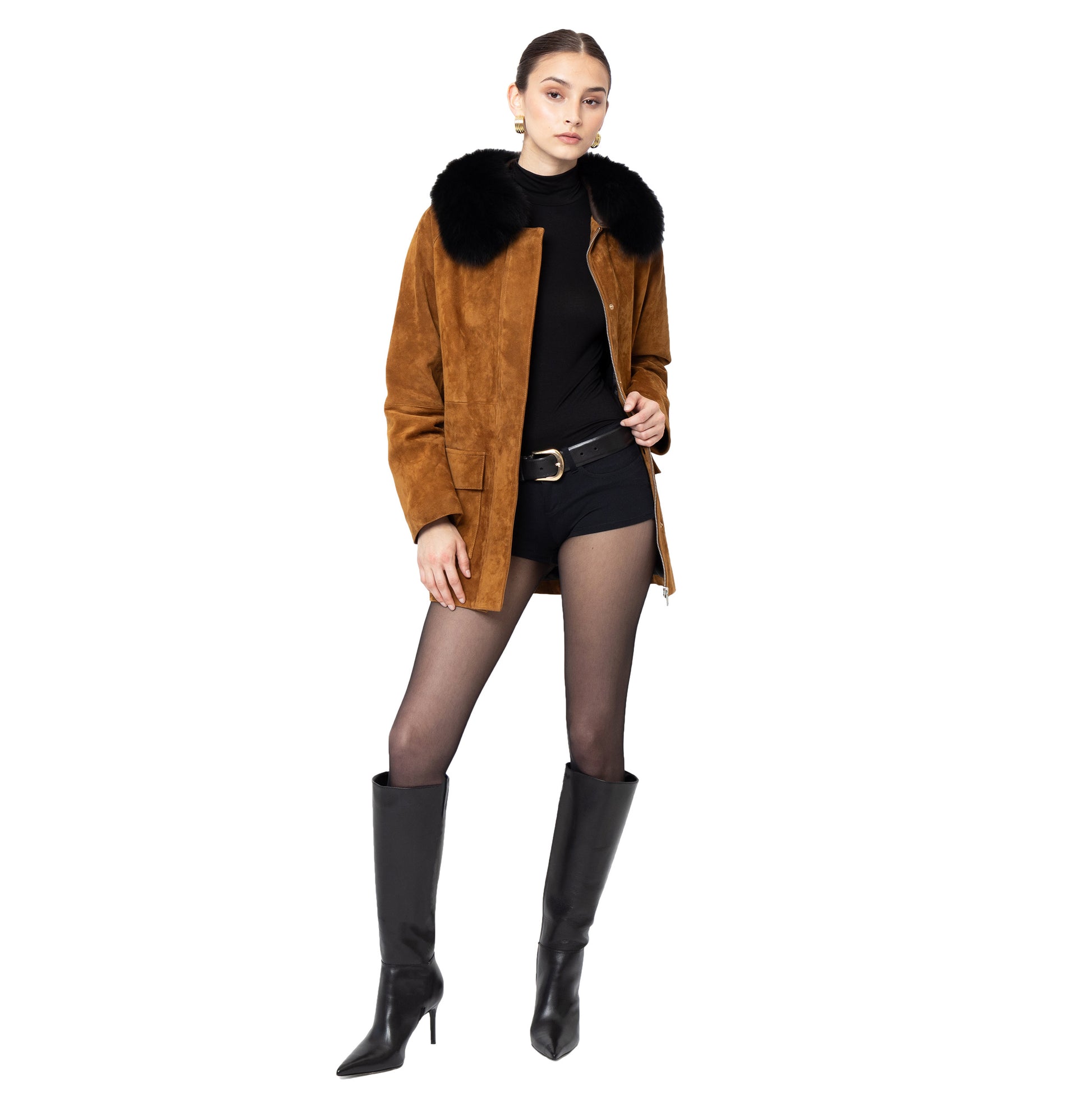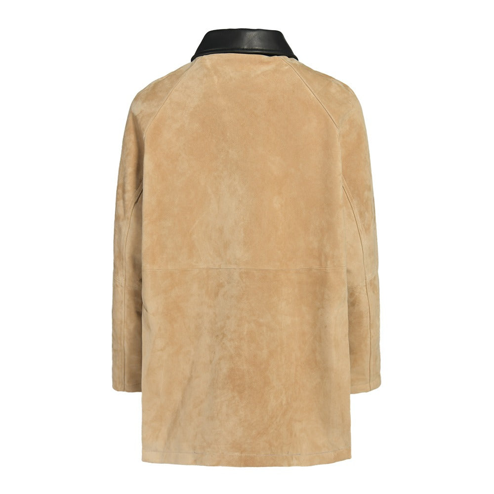 Introducing the ultimate barn jacket, crafted in a luxurious rich suede. Features removable shearling collar, contrasting leather collar and hidden snap closure pockets and zipper. The perfect everyday wardrobe essential to effortlessly elevate your look from day to night.