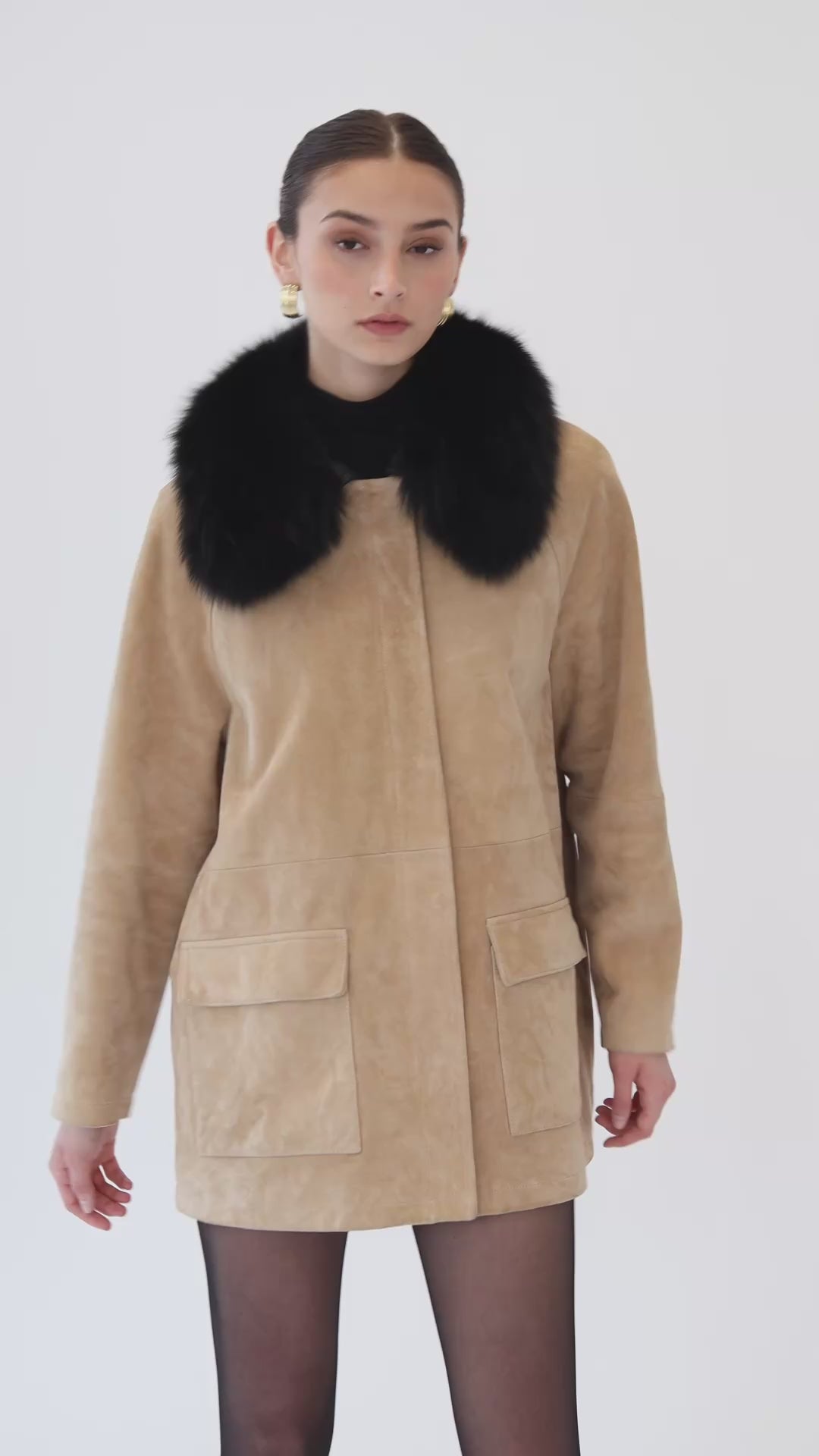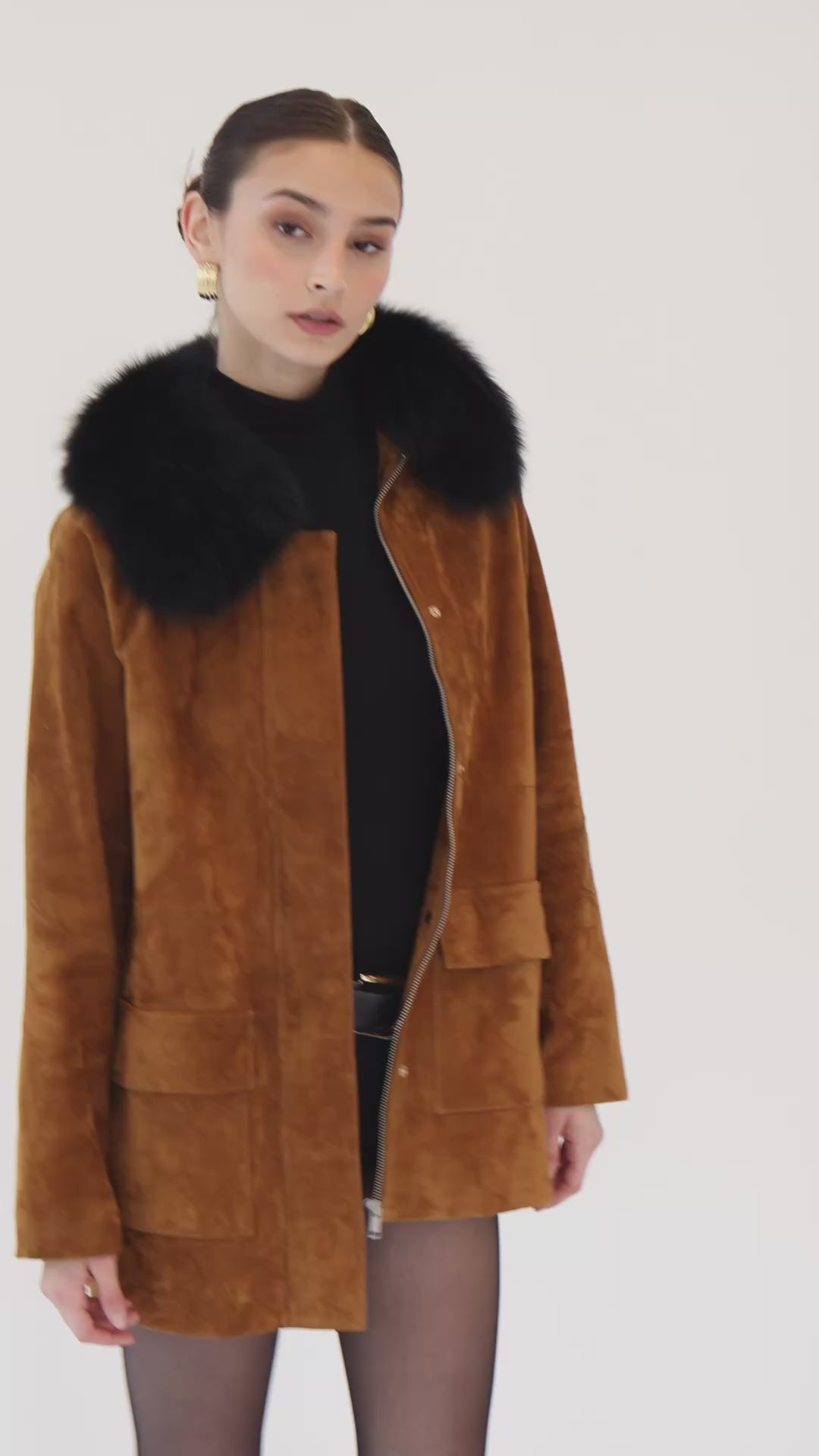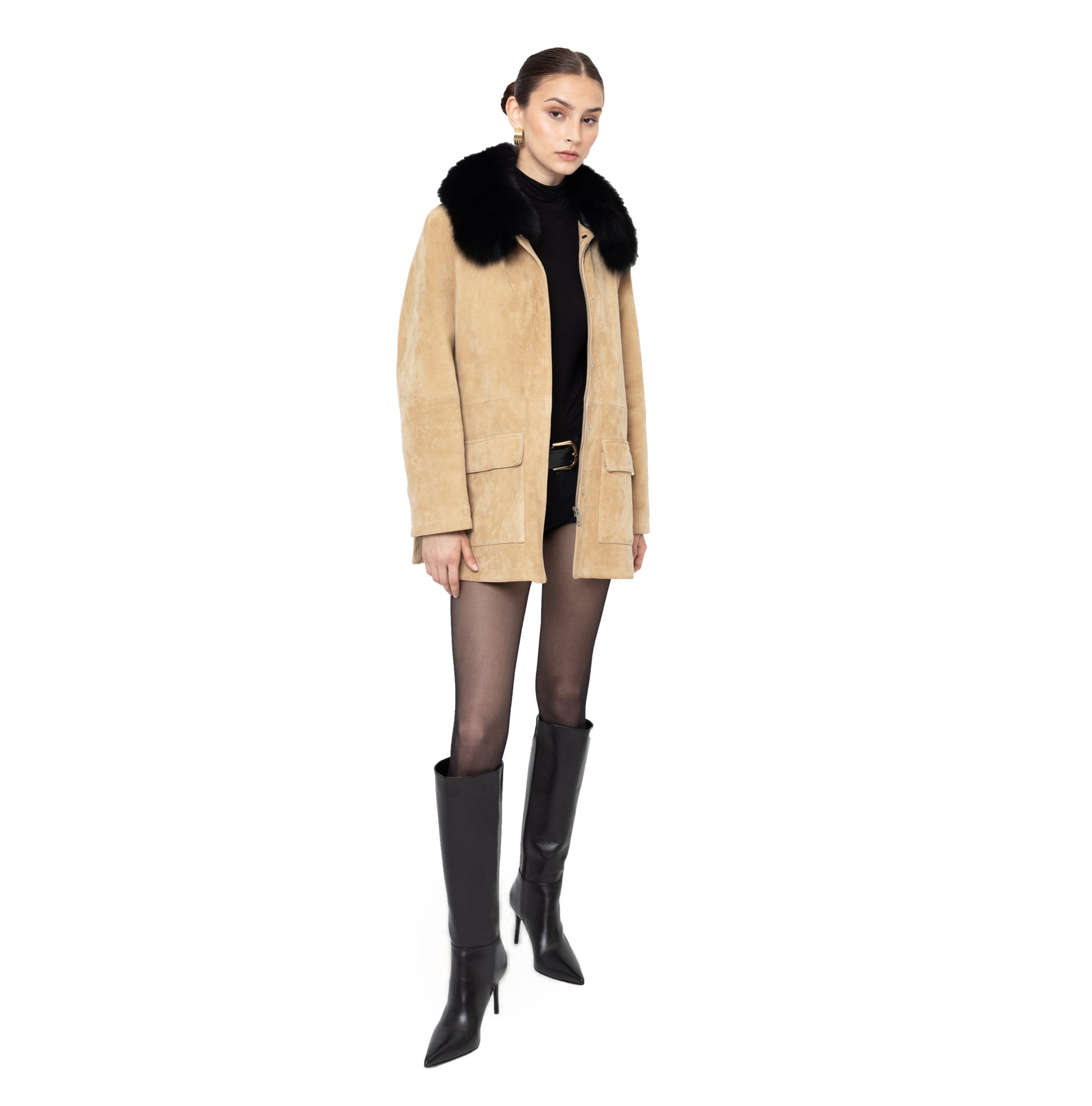Introducing the ultimate barn jacket, crafted in a luxurious rich suede. Features removable shearling collar, contrasting leather collar and hidden snap closure pockets and zipper. The perfect everyday wardrobe essential to effortlessly elevate your look from day to night.