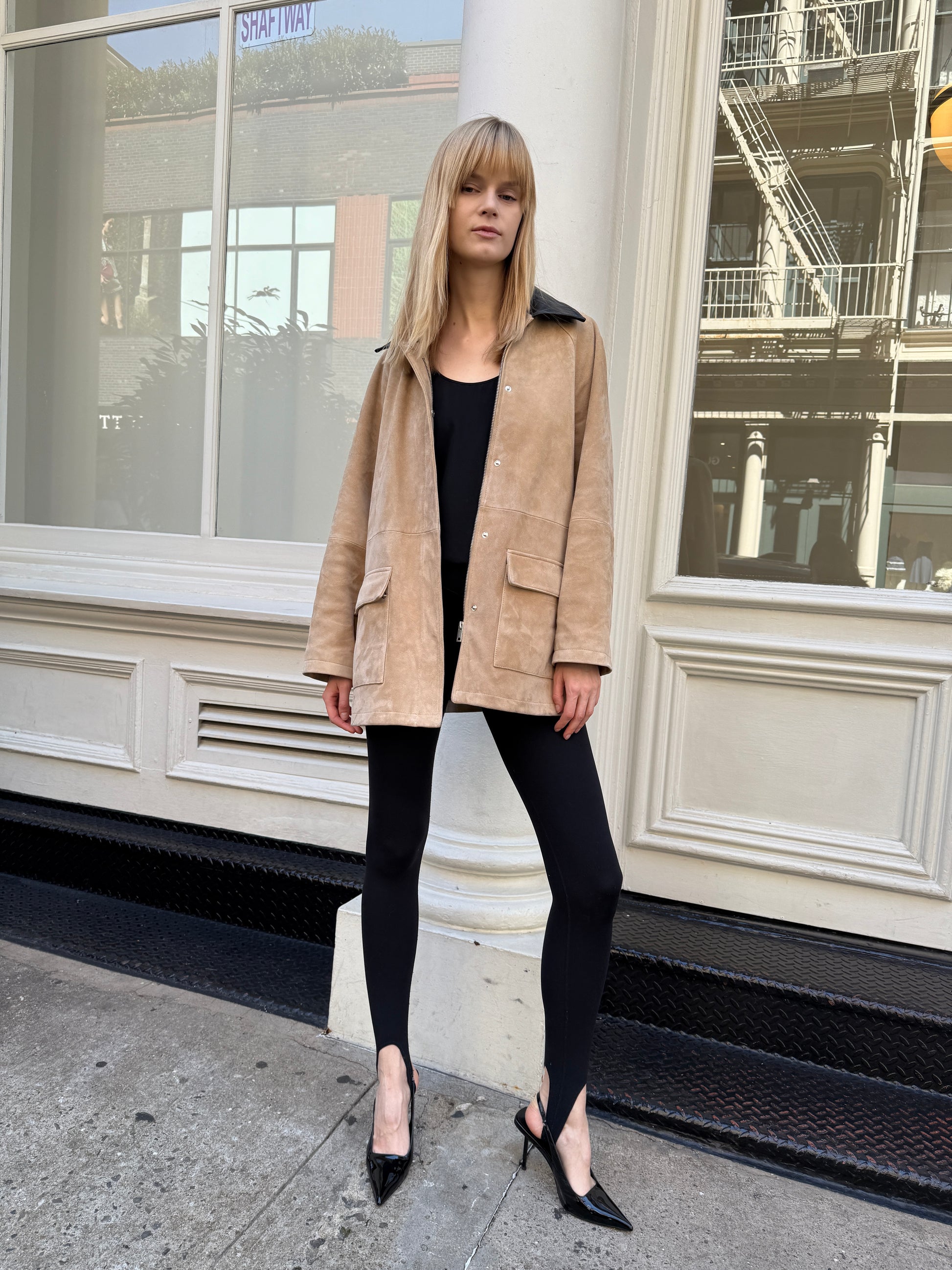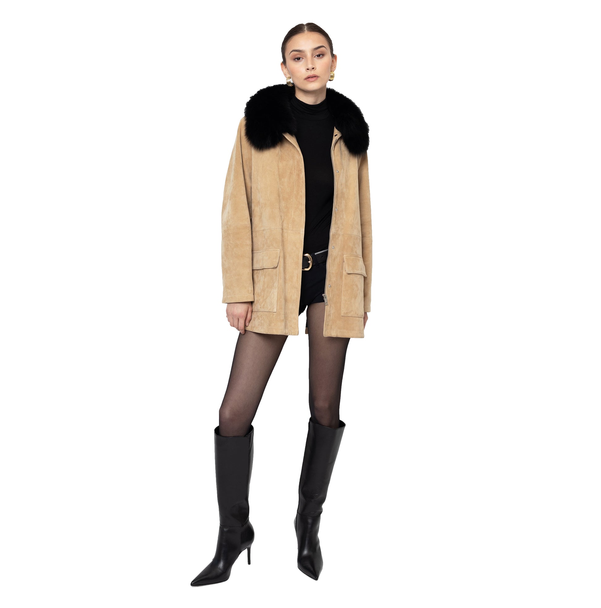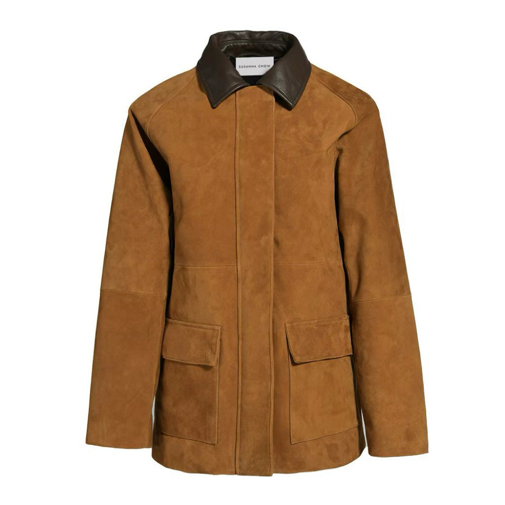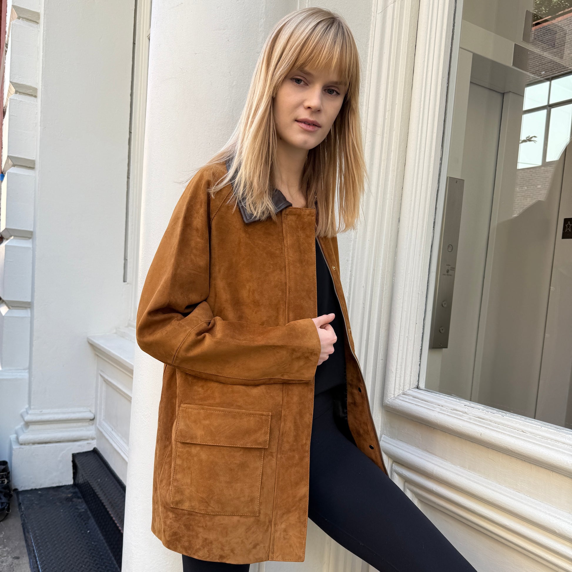 Introducing the ultimate barn jacket, crafted in a luxurious rich suede. Features removable shearling collar, contrasting leather collar and hidden snap closure pockets and zipper. The perfect everyday wardrobe essential to effortlessly elevate your look from day to night.