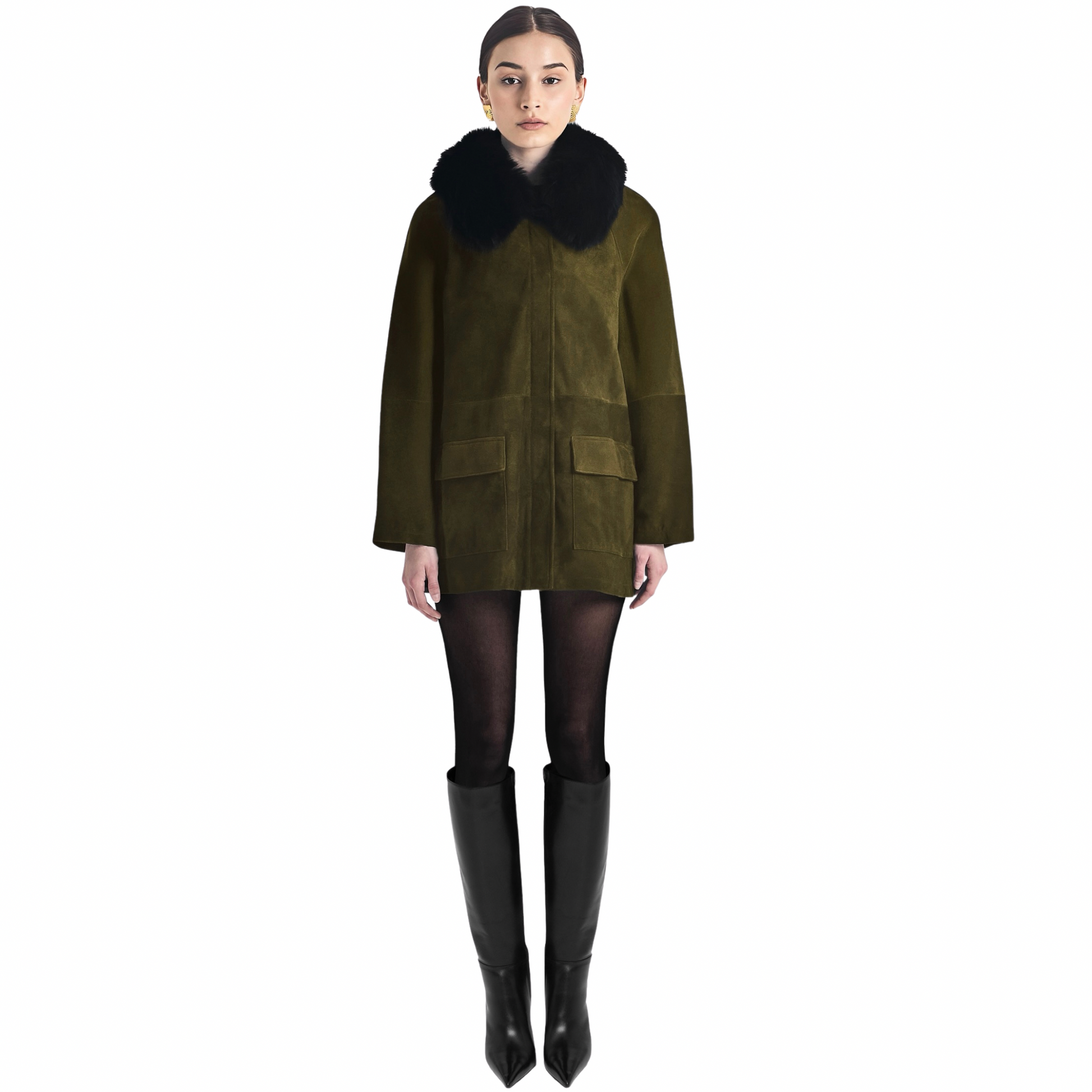 Introducing the ultimate barn jacket, crafted in a luxurious rich suede. Features removable shearling collar, contrasting leather collar and hidden snap closure pockets and zipper. The perfect everyday wardrobe essential to effortlessly elevate your look from day to night.