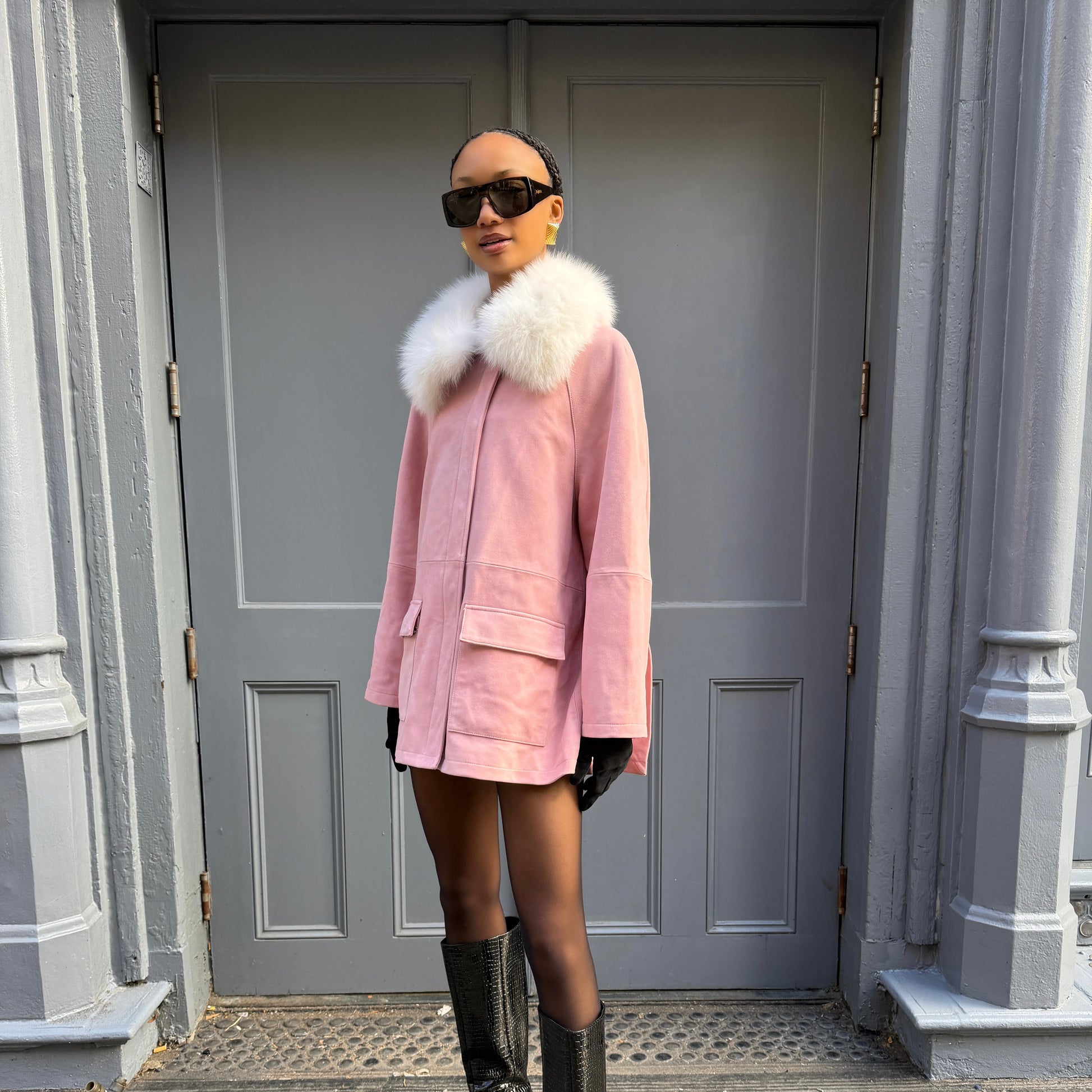 Introducing the ultimate barn jacket, crafted in a luxurious rich suede. Features removable shearling collar, contrasting leather collar and hidden snap closure pockets and zipper. The perfect everyday wardrobe essential to effortlessly elevate your look from day to night.