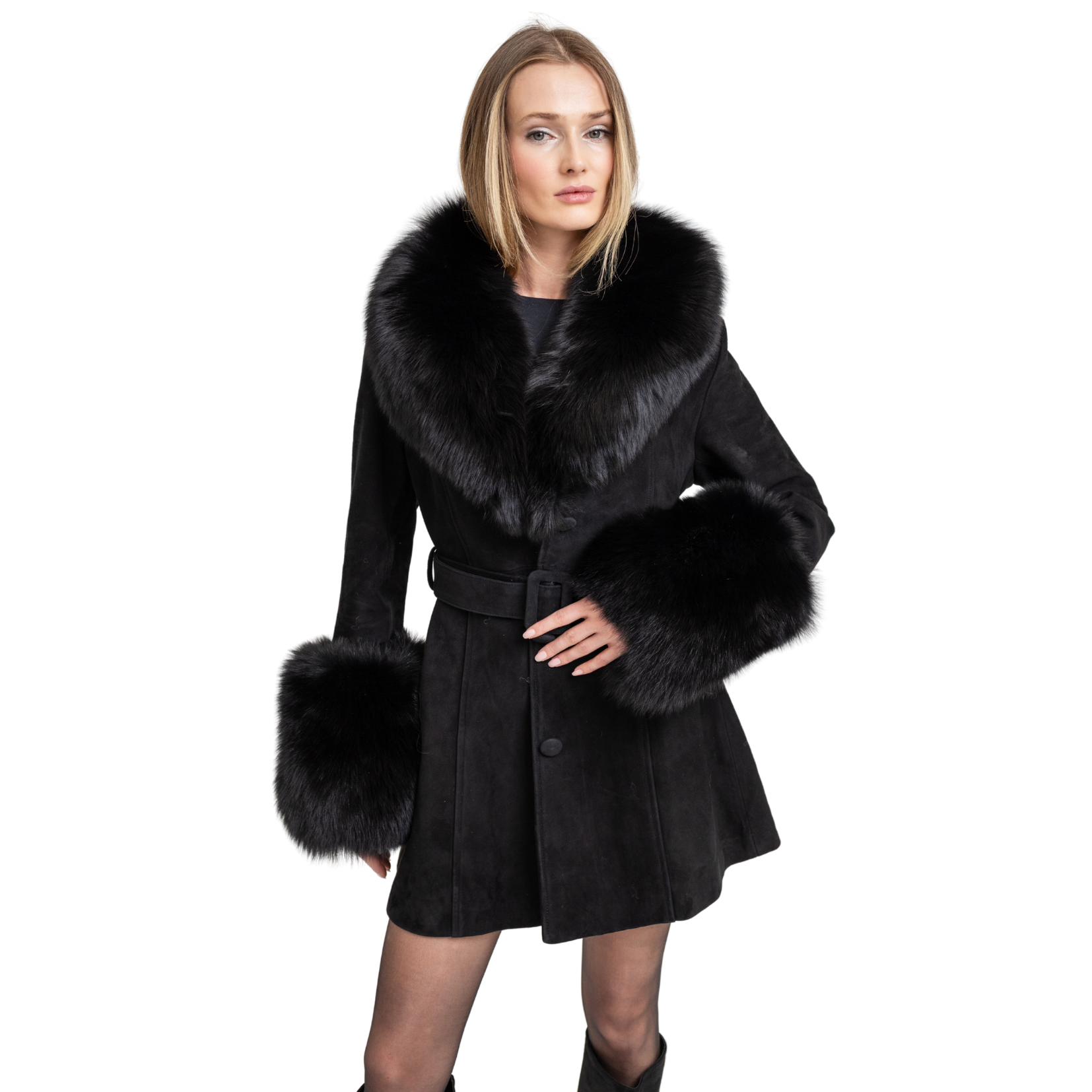 Elegant and sophisticated, the Roxy coat features a detachable shearling collar and cuffs with exterior pockets. Matching belt also included. As each piece is handmade to order, please allow 3-4 weeks for delivery.